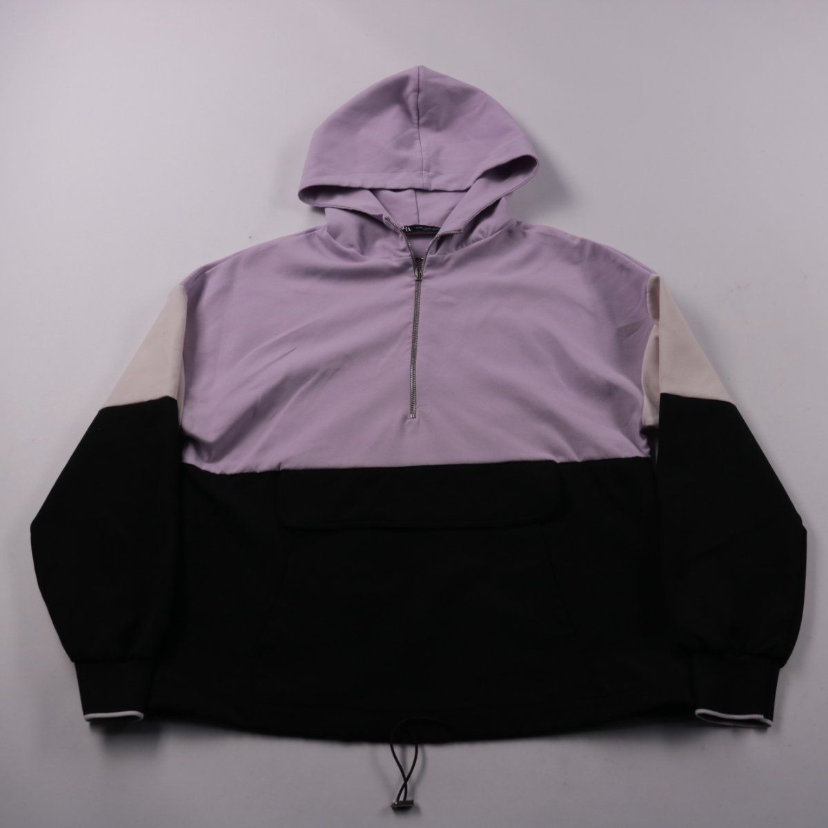 Толстовка Zara с капюшоном и короткой молнией, выполнена в колор-блоке (лавандовый/бежевый/чёрный). Подойдёт для повседневных образов и прогулок в прохладную погоду. Практичный плюс — регулируемый низ на шнурке, можно менять посадку и защищаться от ветра.