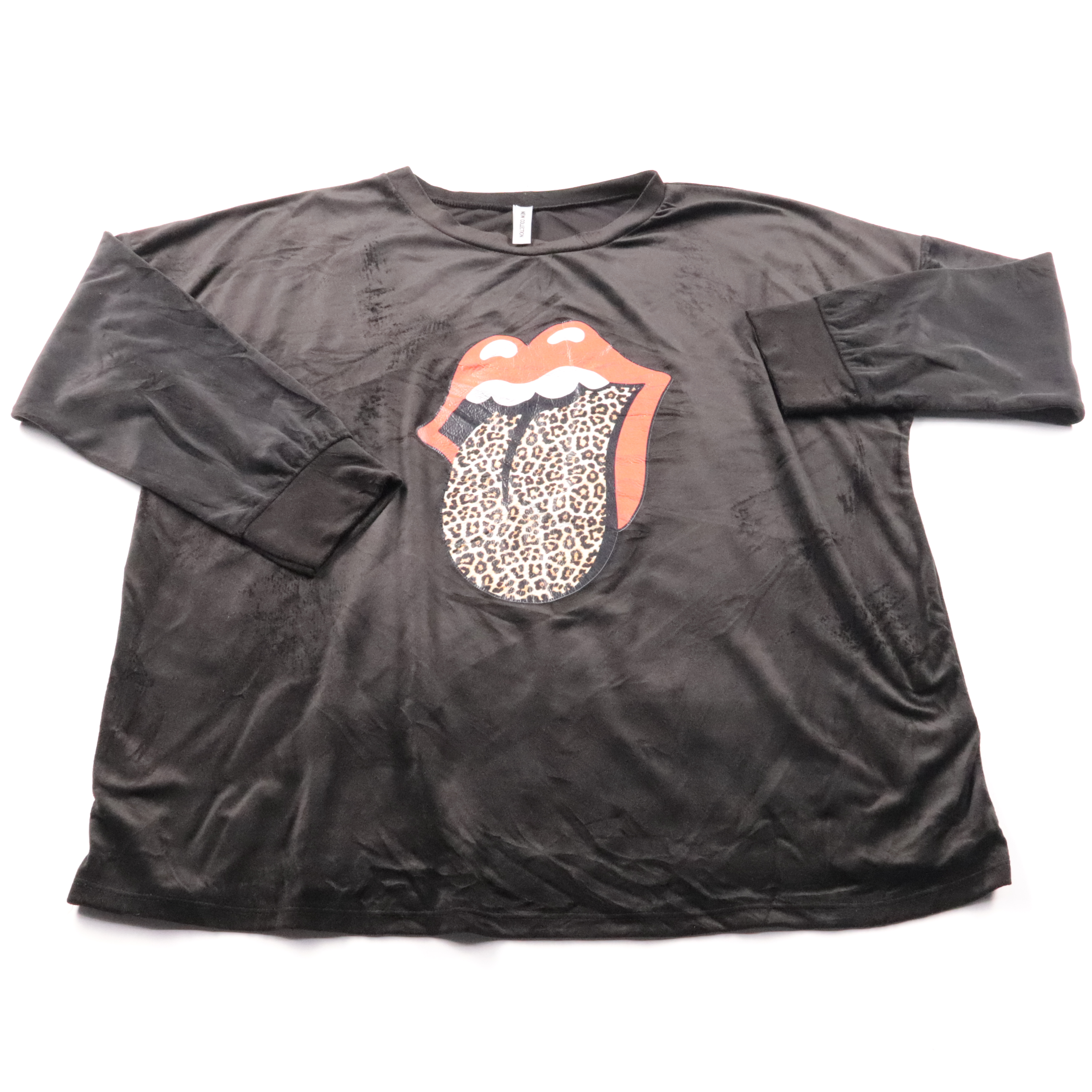 Женский лонгслив New Collection чёрного цвета с принтом губ и леопардового языка. Подойдёт для повседневных образов и вечеринок, легко сочетается с джинсами или юбкой. Длинный рукав добавляет практичности в прохладную погоду.