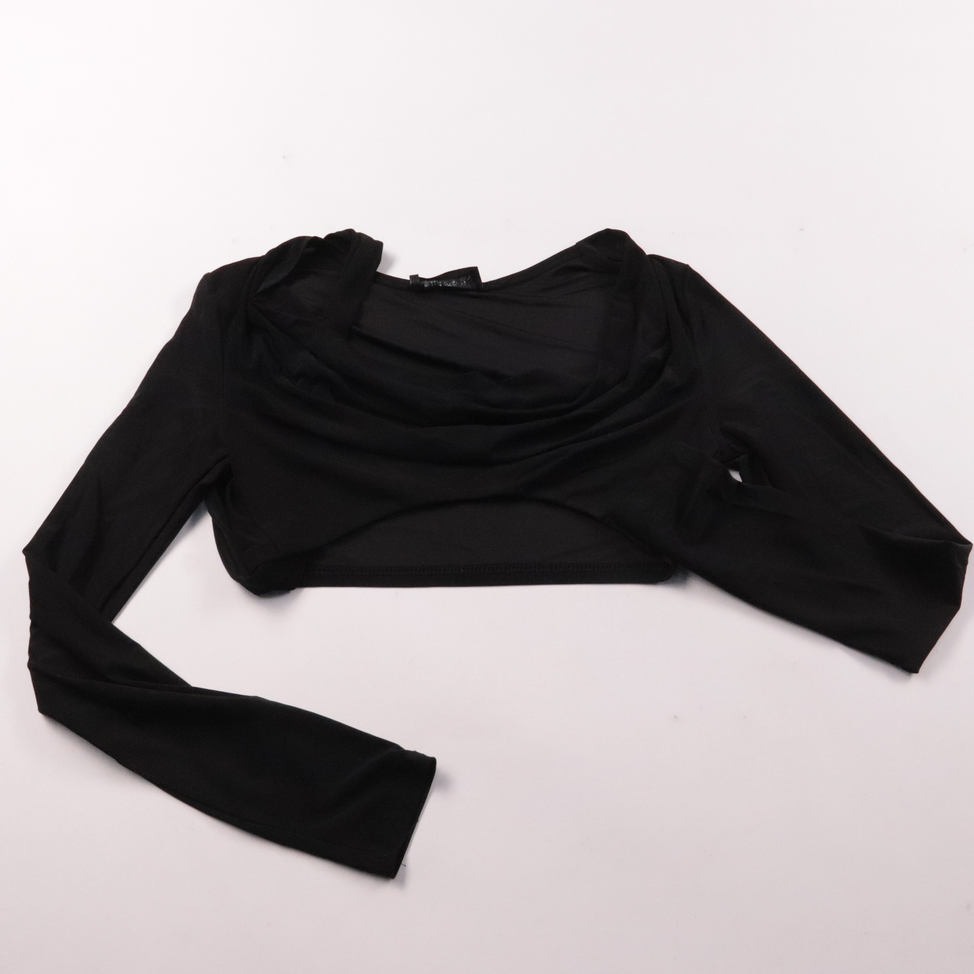 Черный укороченный лонгслив Club L из плотного эластичного трикотажа с драпировкой по переду. Подойдет для вечеринок и образов на выход, хорошо сочетается с брюками или юбкой с высокой посадкой. Материал тянется и комфортно садится по фигуре.