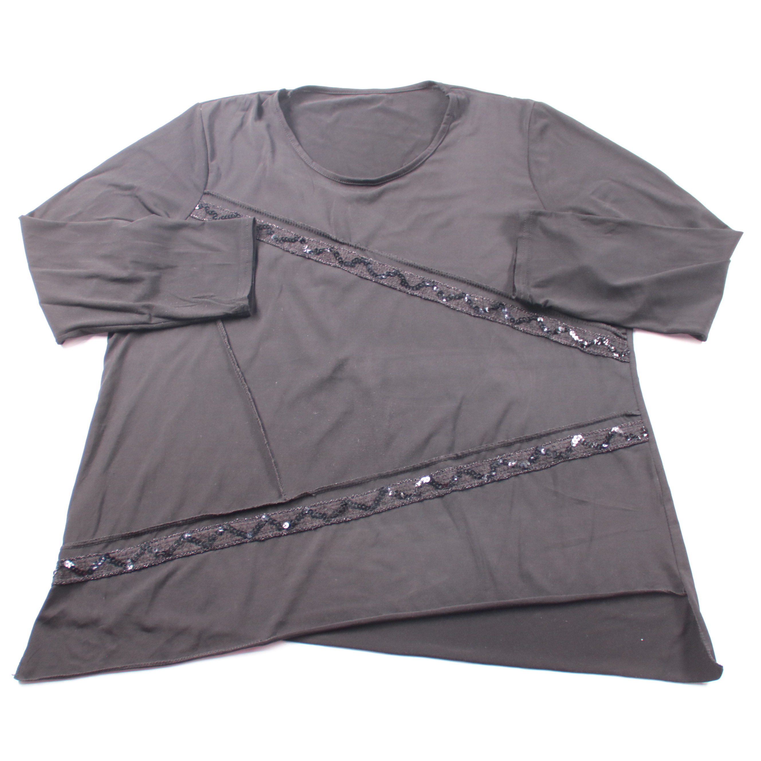 Женский лонгслив чёрного цвета с круглым вырезом и декоративными полосами с пайетками. Подойдёт для повседневных образов и для выхода, когда хочется добавить немного блеска без лишней яркости. Мягкий трикотаж комфортно тянется и не стесняет движений.