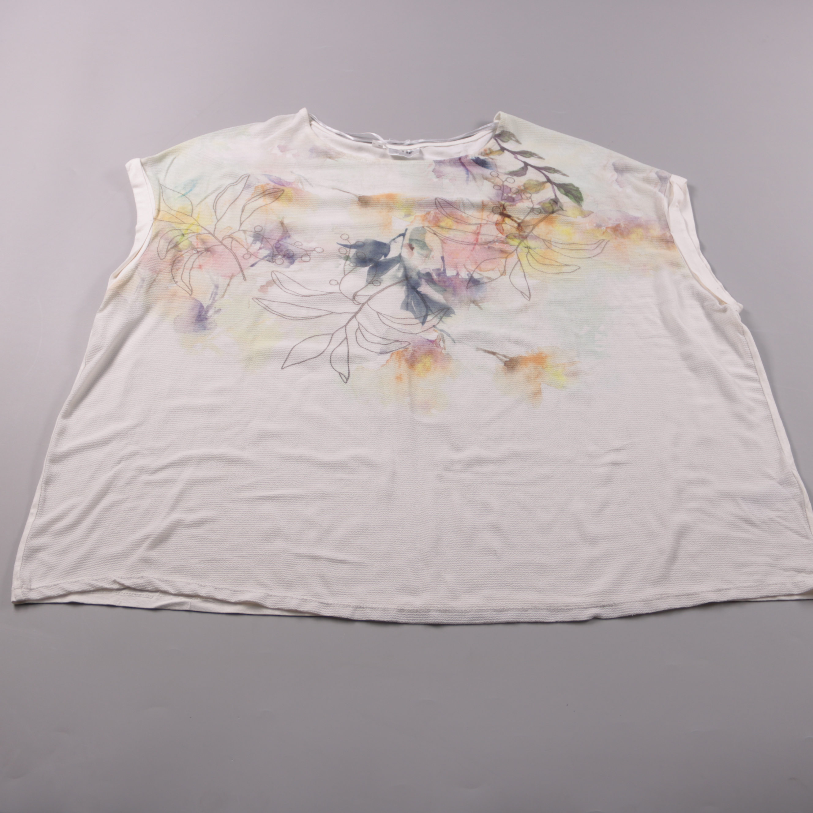 Женская футболка BPC молочного цвета с акварельным цветочным принтом по плечам и груди. Подойдёт для повседневных летних образов с джинсами, брюками или юбкой. Лёгкая эластичная ткань приятна в носке и не сковывает движения.