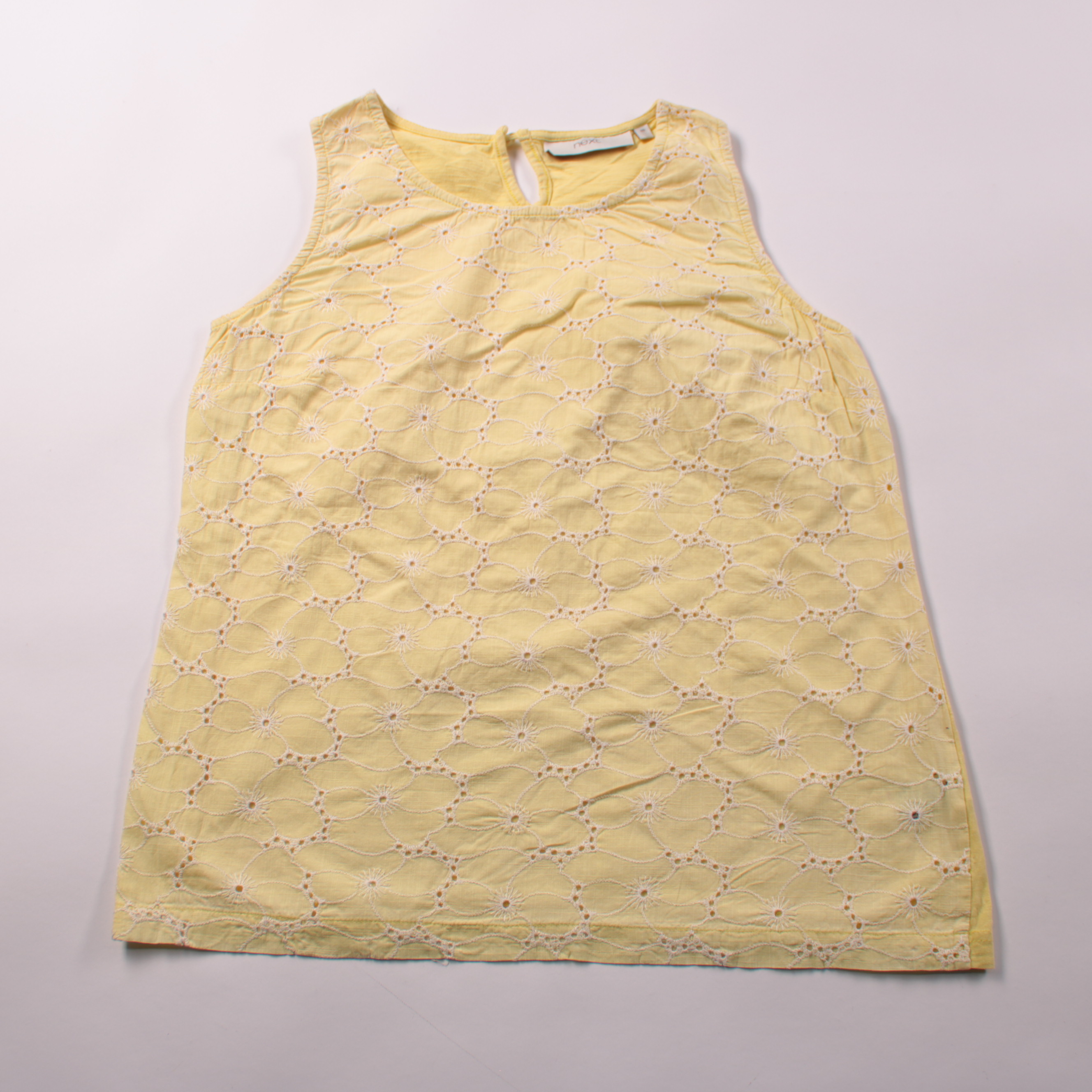 Женский топ Next из хлопка в нежно-жёлтом цвете с вышивкой ришелье и круглым вырезом. Подойдёт для летних прогулок и отпуска, легко сочетается с джинсами, шортами или юбкой. Дышащий материал комфортен в жару и прост в уходе.