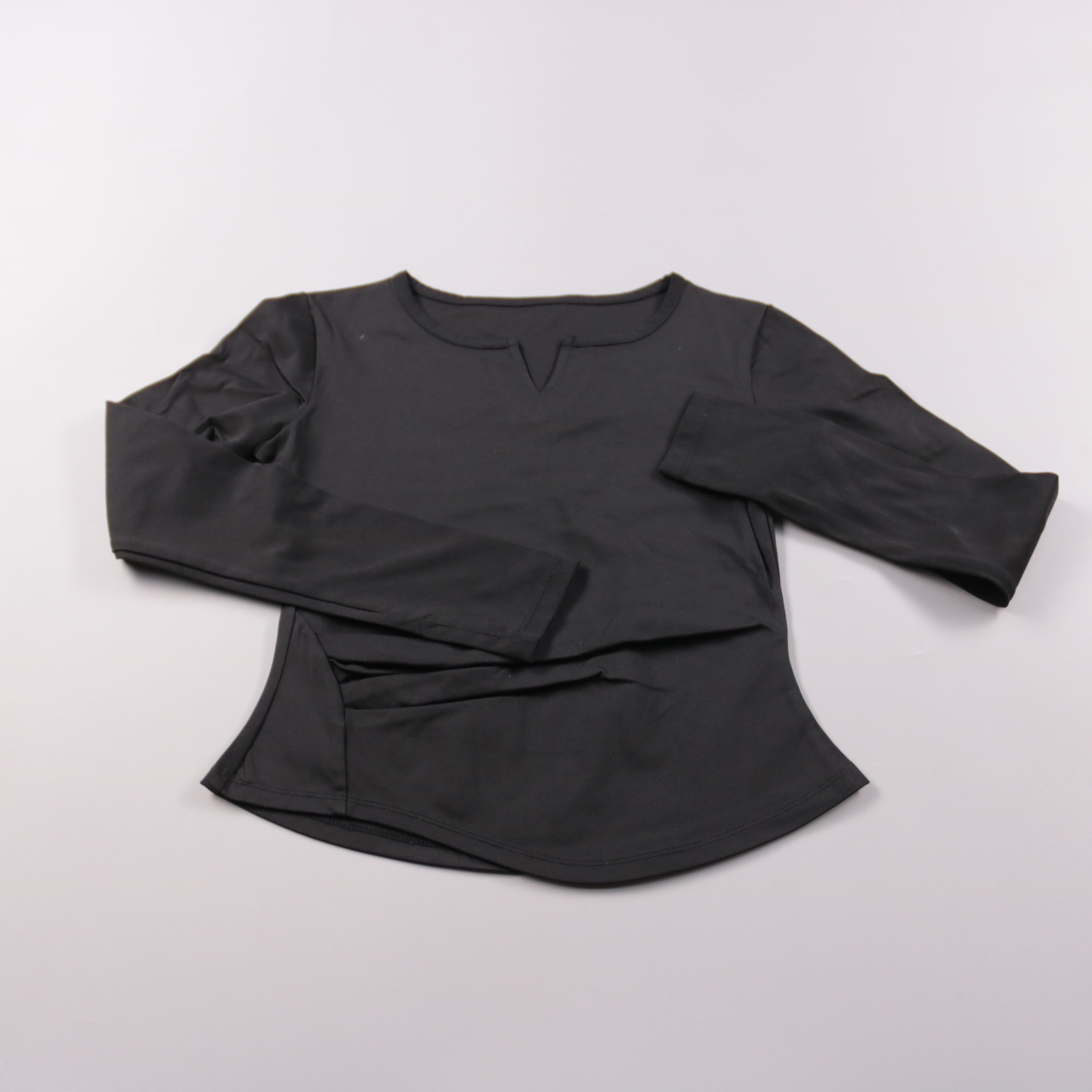 Женский чёрный лонгслив с длинным рукавом и небольшим V-разрезом у горловины. Подойдёт для повседневных образов и офиса, легко сочетается с джинсами и юбками. Практичная ткань со спандексом хорошо тянется и комфортно сидит по фигуре.