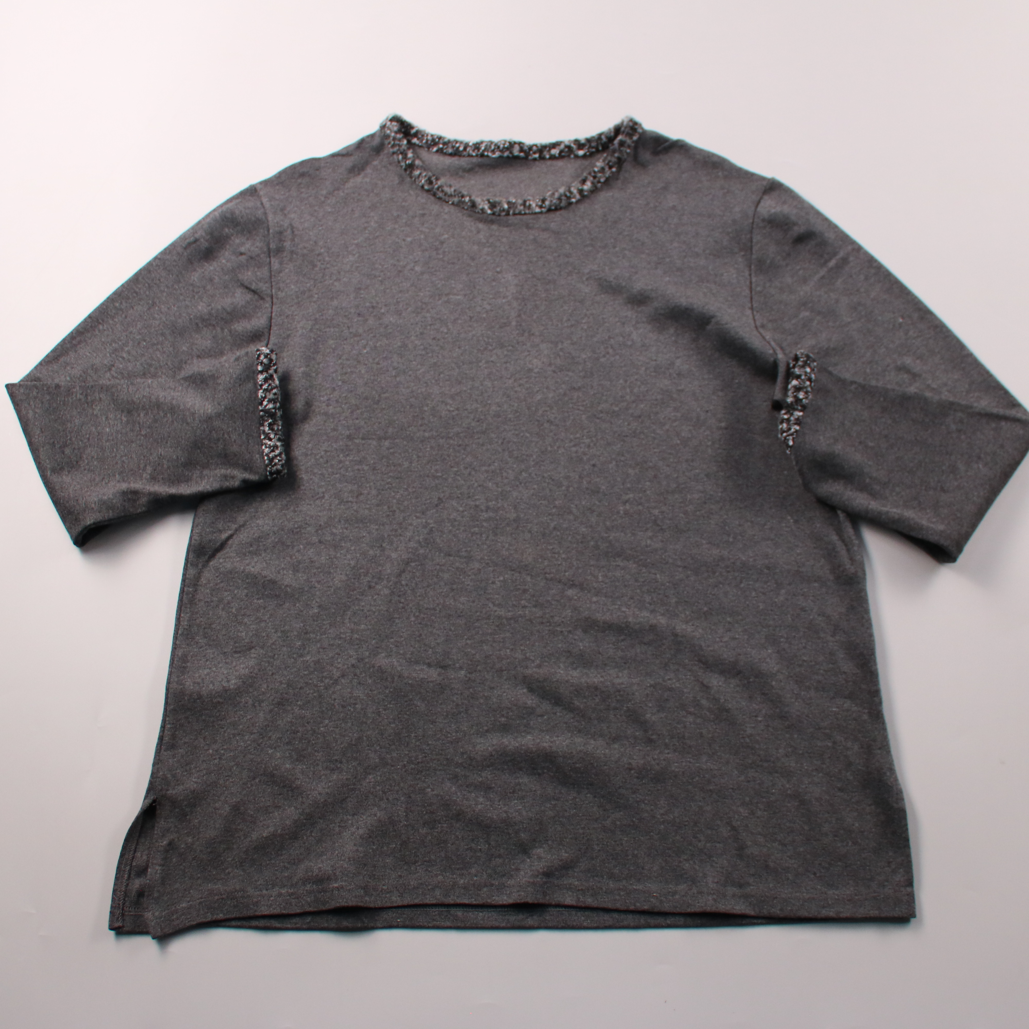Женский лонгслив серого цвета с декоративной отделкой по горловине и на рукавах. Подойдёт для повседневных образов в офис или на каждый день, легко сочетается с джинсами и юбками. Практичный плюс — эластичный материал хорошо тянется и комфортно сидит.