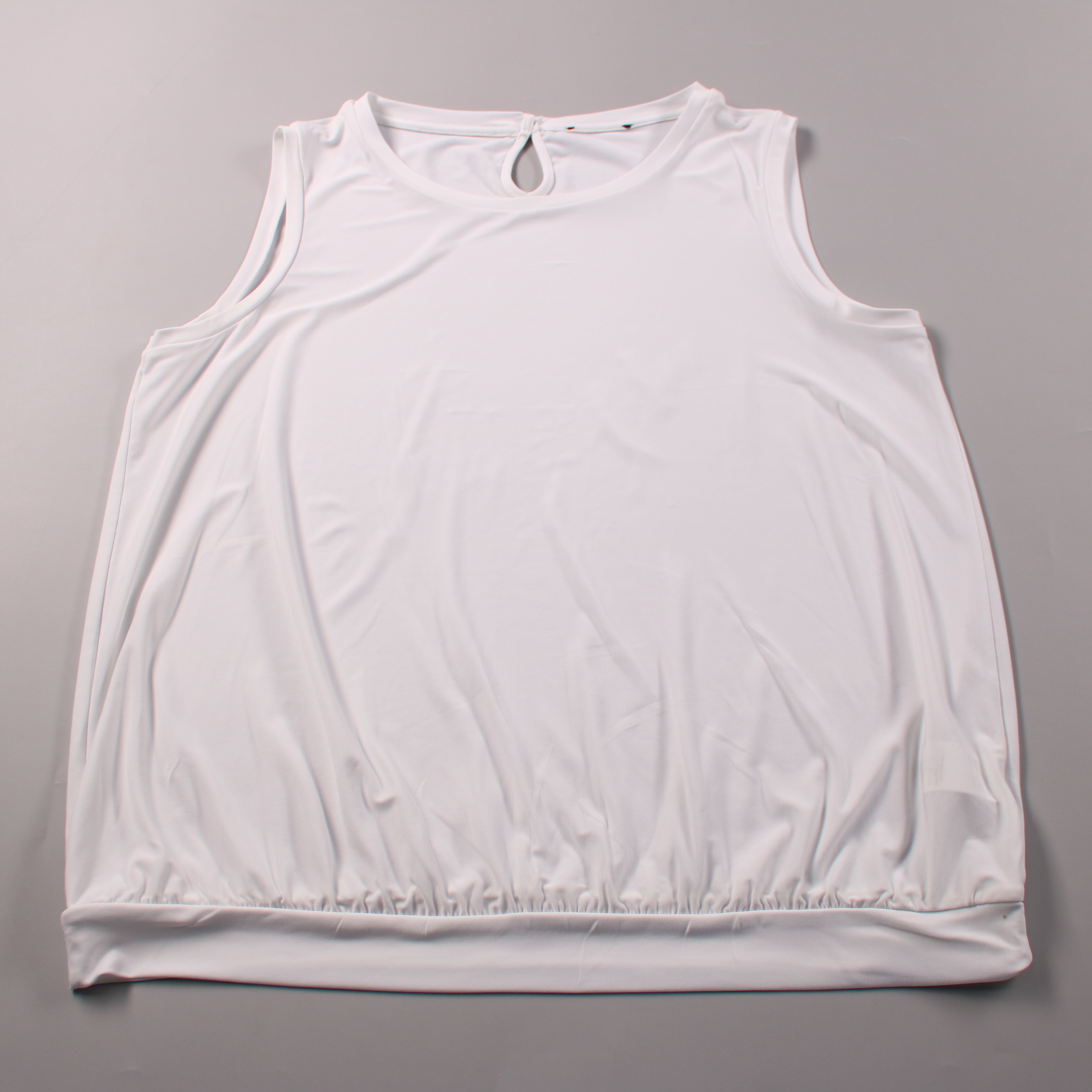 Женский белый топ без рукавов из эластичного материала, с каплевидным вырезом на спинке и мягкой сборкой по низу. Подойдёт для тренировок, прогулок и повседневных образов в тёплую погоду. Быстро сохнет и почти не мнётся, удобно брать с собой в поездки.