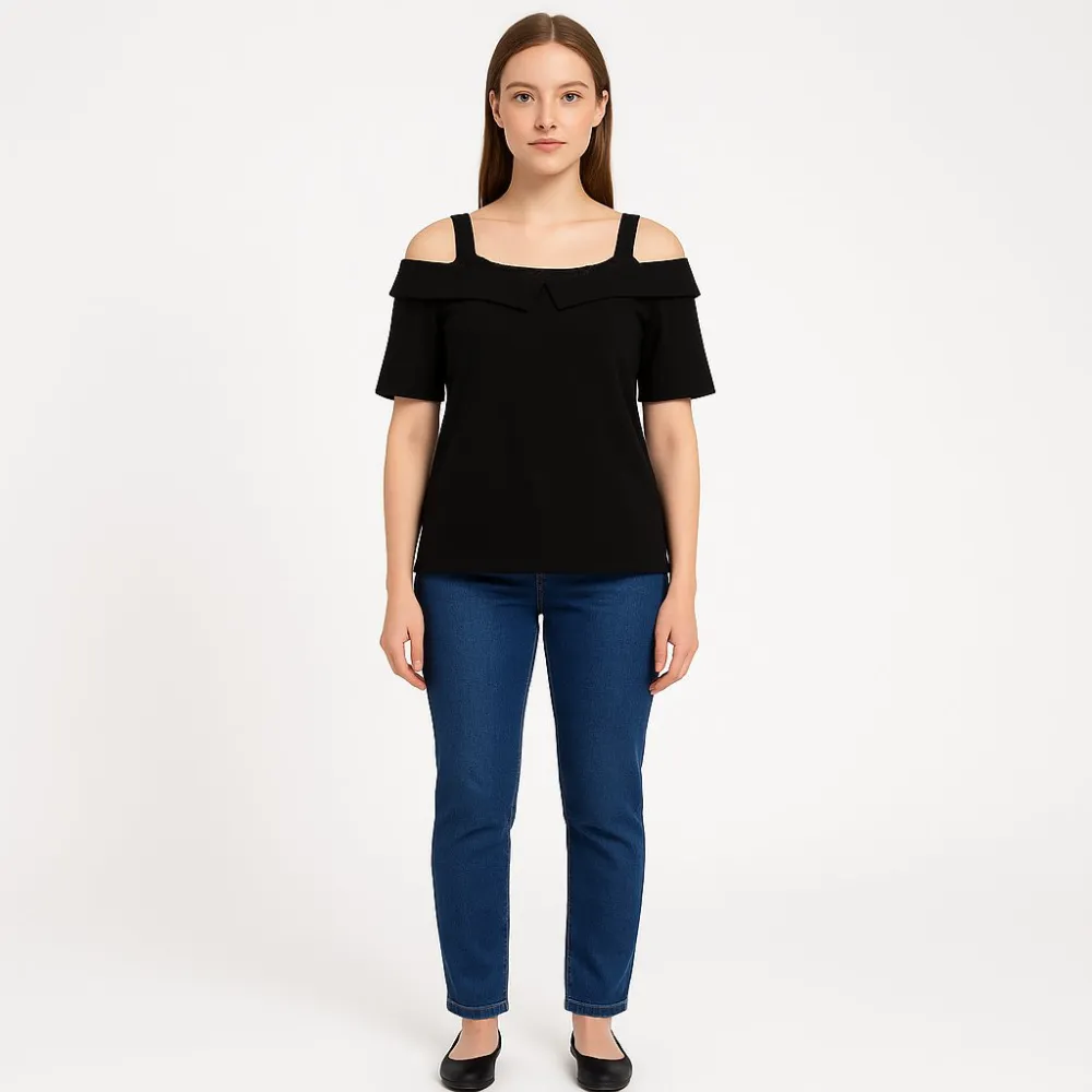 Женский чёрный топ с открытыми плечами и широкими бретелями, бренд на бирке не указан. Подойдёт для повседневных образов и выхода, легко сочетается с джинсами или юбкой. Практичный плюс — тёмный цвет не маркий и универсальный.