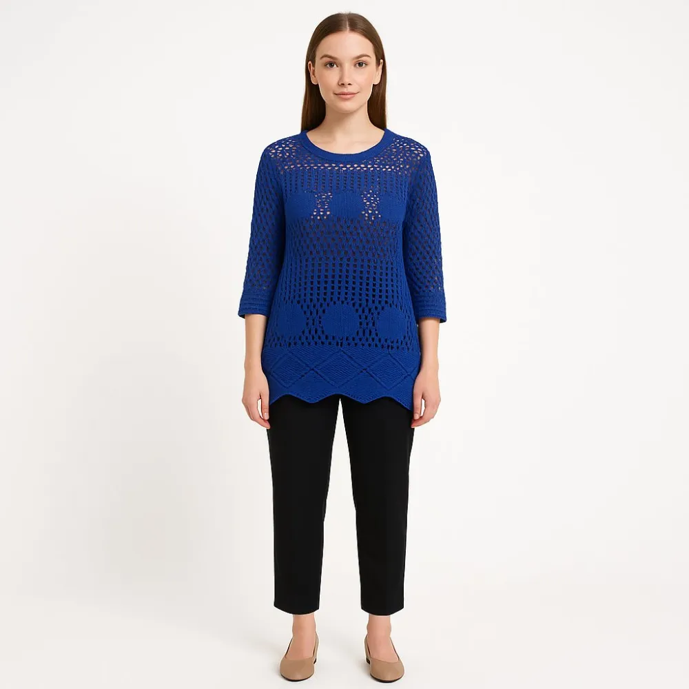 Женская ажурная туника без бренда, насыщенного синего цвета, с рукавом 3/4 и круглым вырезом. Подойдёт для повседневных образов с топом/майкой и брюками или джинсами в тёплую демисезонную погоду. Полиэстер не сильно мнётся и прост в уходе.