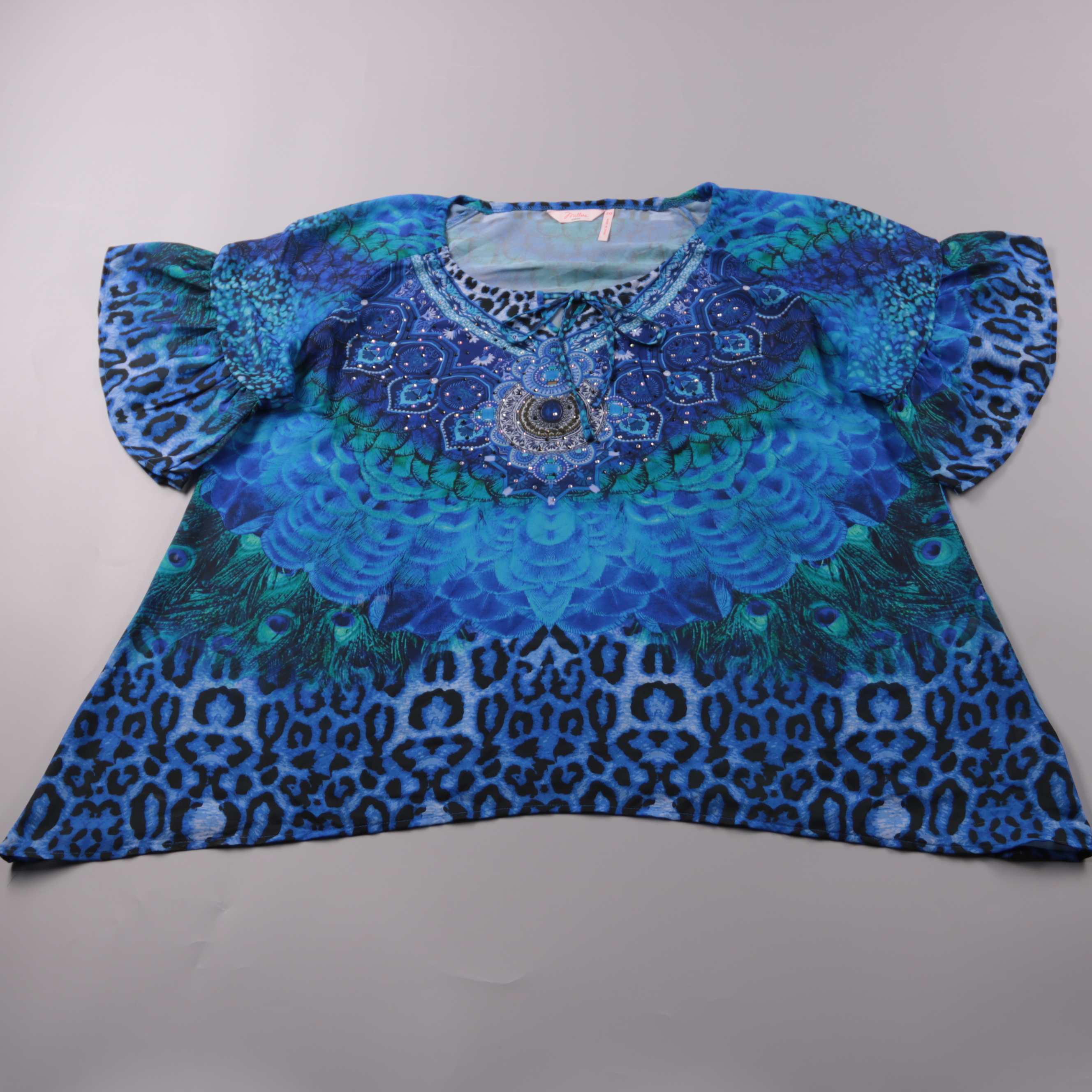 Женская футболка Millers с ярким сине-зелёным принтом и декоративной отделкой/стразами в зоне горловины. Подойдёт для летних прогулок и отдыха, хорошо сочетается с однотонными джинсами или шортами. Лёгкий полиэстер почти не мнётся и быстро сохнет.