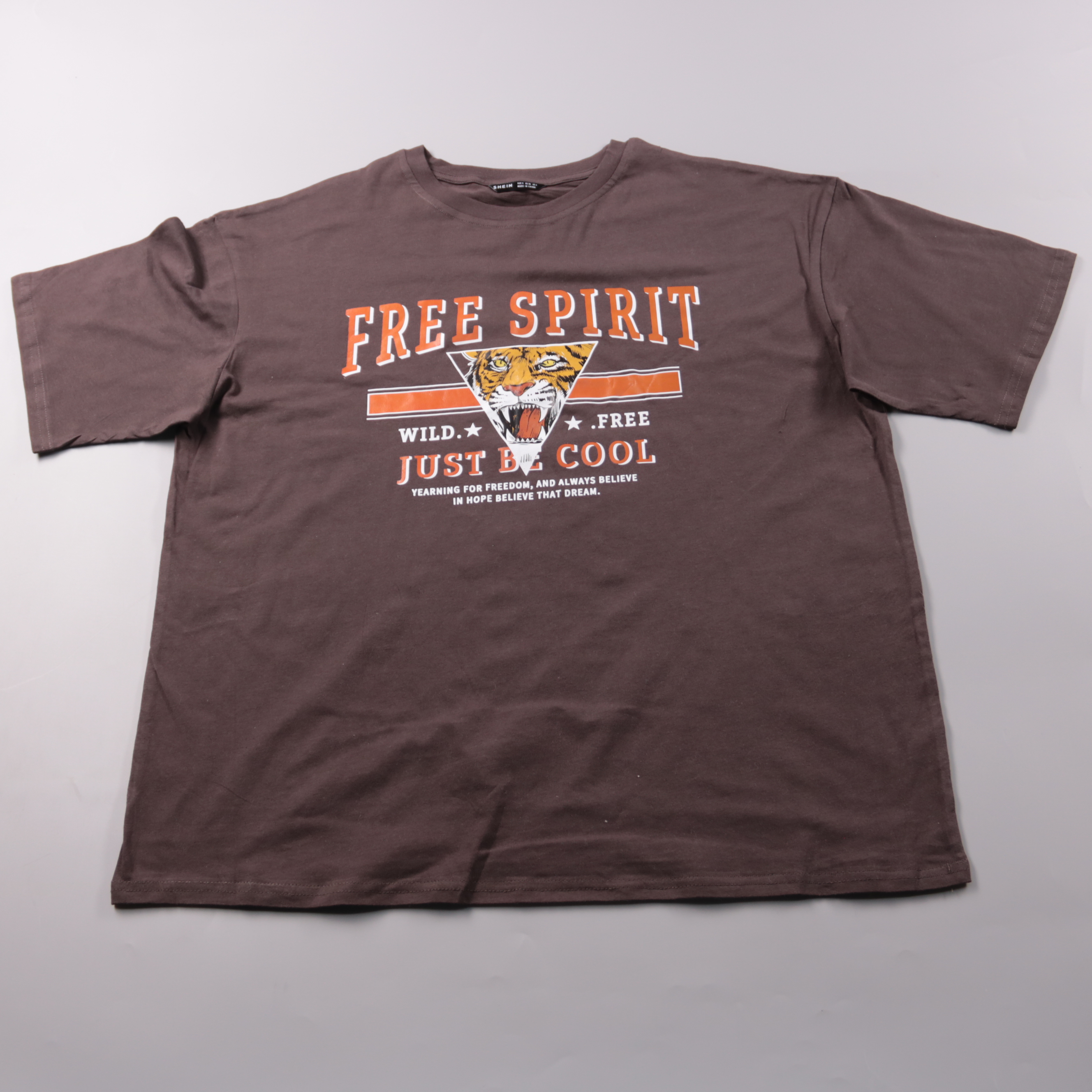 Футболка Shein из хлопка, коричневого цвета, с принтом и надписью «FREE SPIRIT» спереди. Подойдёт для повседневных образов и отдыха, легко сочетается с джинсами и шортами. Практичный плюс — мягкая ткань и простой уход в машинной стирке.