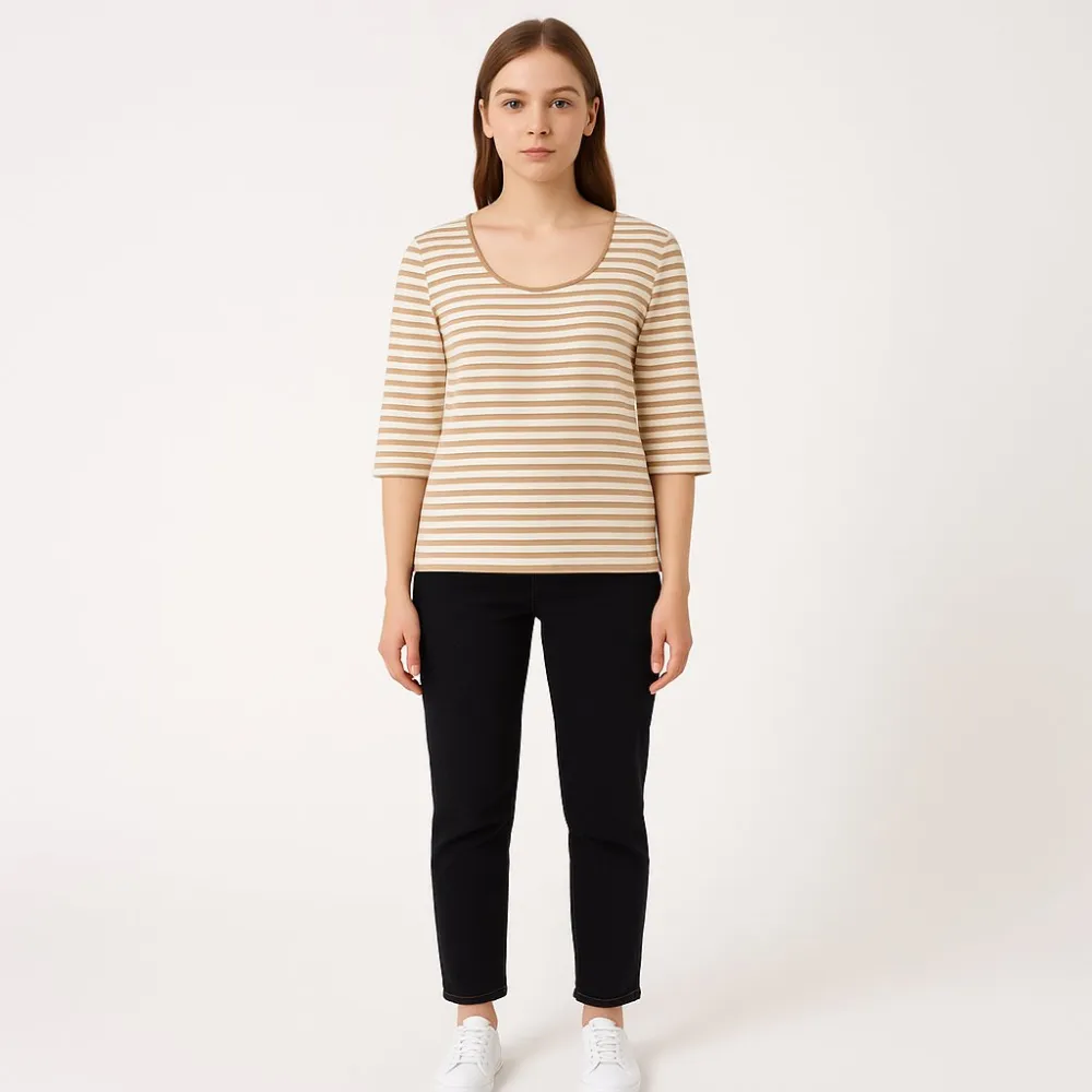 Лонгслив Gerard Darel в бежево-белую полоску с округлым вырезом и рукавом 3/4. Подойдёт для повседневных образов и офиса с жакетом, легко сочетается с джинсами и брюками. Трикотаж на основе вискозы приятный к телу и хорошо держит форму.