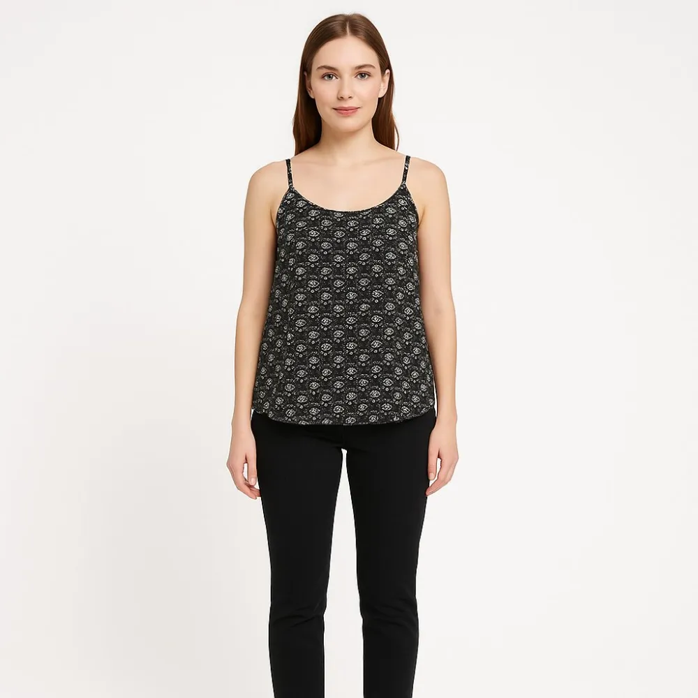 Топ Oasis на тонких бретелях с мелким контрастным принтом на чёрном фоне. Подойдёт для повседневных образов летом или как первый слой под жакет/кардиган в прохладную погоду. Лёгкий полиэстер быстро сохнет и почти не мнётся.