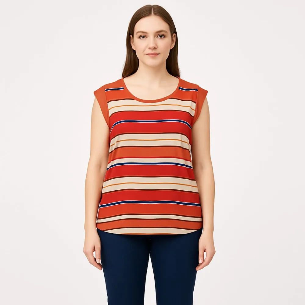 Футболка Atmosphere из вискозы с яркими горизонтальными полосками и округлым вырезом. Подойдёт для лета и тёплой погоды, легко сочетается с джинсами или шортами. Ткань лёгкая и приятная к телу, быстро сохнет после стирки.