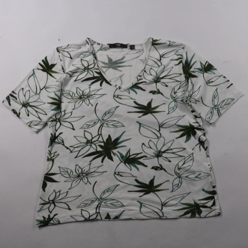 Футболка TCM белого цвета с зелёным растительным принтом и V-образным вырезом. Подойдёт для повседневных летних образов и отдыха, легко сочетается с джинсами или шортами. Мягкий трикотаж хорошо дышит и удобен в носке.