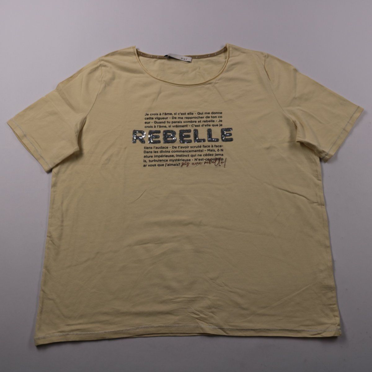 Женская футболка Oui в бежевом цвете с принтом и надписью «REBELLЕ» с декоративными пайетками. Подойдёт для повседневных образов и отдыха, легко сочетается с джинсами и юбками. Мягкий трикотаж комфортно носится и не сковывает движения.