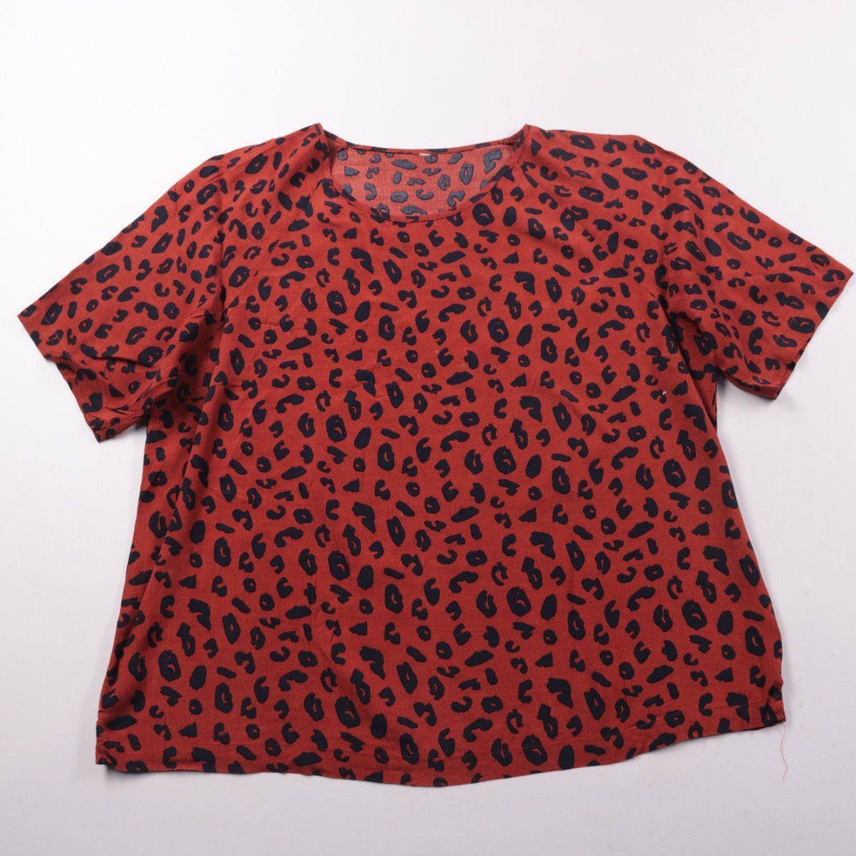 Женская футболка с леопардовым принтом на красном фоне и круглым вырезом. Подойдёт для повседневных образов летом и в качестве слоя под жакет или кардиган в межсезонье. Лёгкая ткань и свободная посадка не сковывают движения.