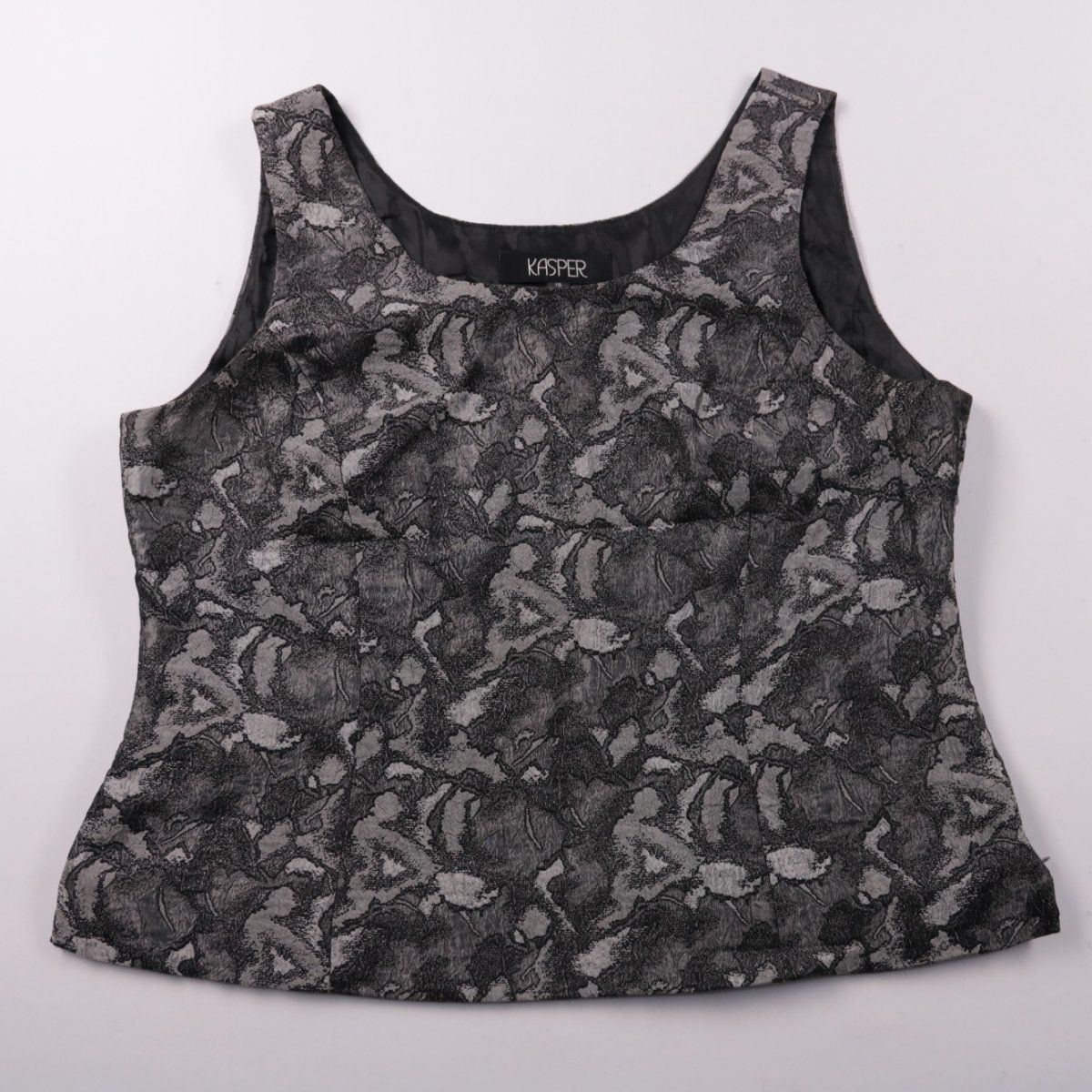 Топ Kasper из плотной фактурной ткани с серо-чёрным узором и округлым вырезом. Подойдёт для офиса и на выход — легко сочетать с юбкой или брюками. Практичный плюс: ткань держит форму и выглядит аккуратно.
