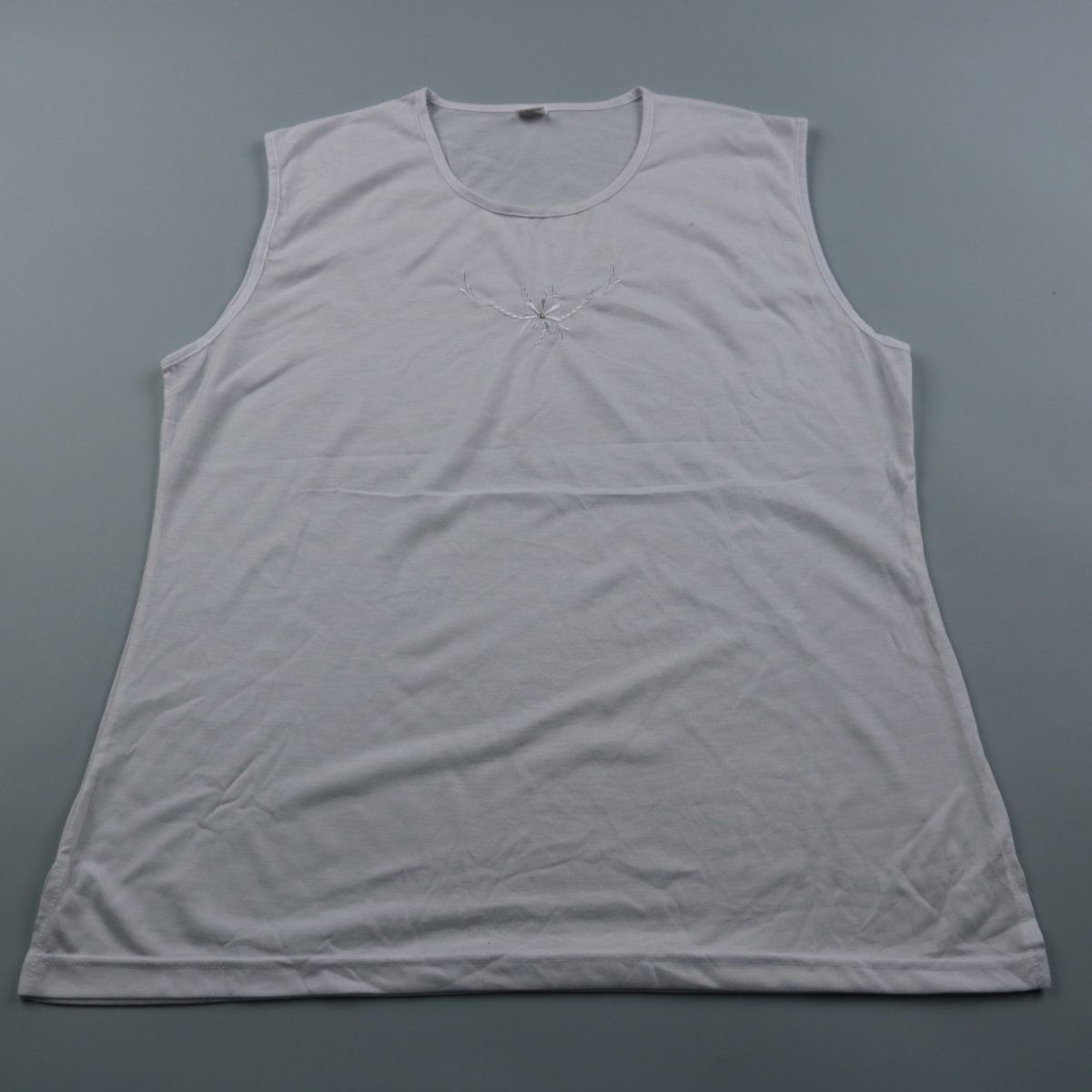 Женская белая майка без бренда, с небольшим вышитым цветком на груди. Подойдёт для лета, дома или как базовый слой под кардиган/пиджак. Смесовая ткань с хлопком приятна к телу и меньше мнётся.