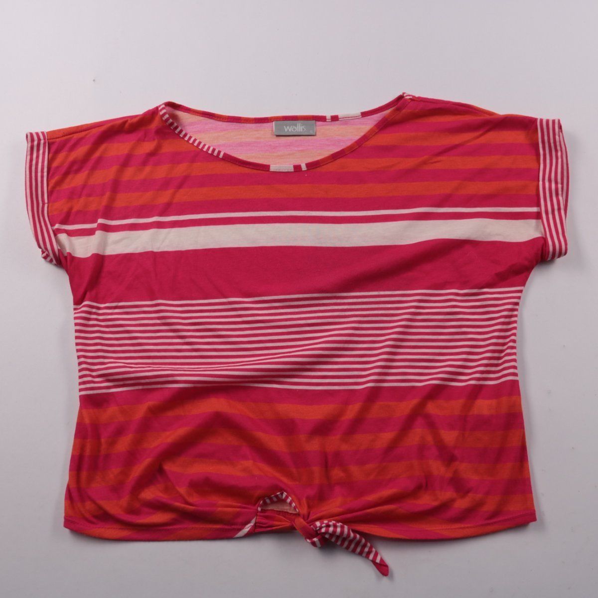 Футболка Wallis в яркую полоску (розовый/оранжевый/белый) с коротким рукавом и завязкой спереди по низу. Подойдёт для повседневных летних образов и отдыха. Полиэстер практичен в уходе и быстро сохнет.