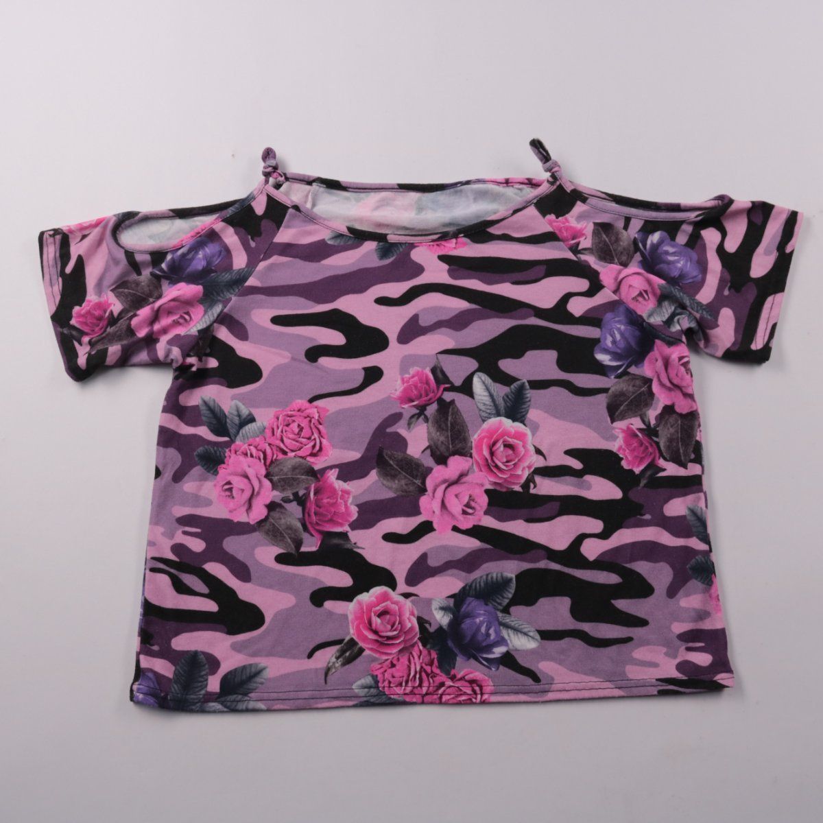 Женский топ с открытыми плечами и завязками, бренд не указан. Принт камуфляж в розово-фиолетовых тонах с цветами, подойдет для лета и отдыха. Ткань эластичная и быстро сохнет, удобно носить в повседневных образах.