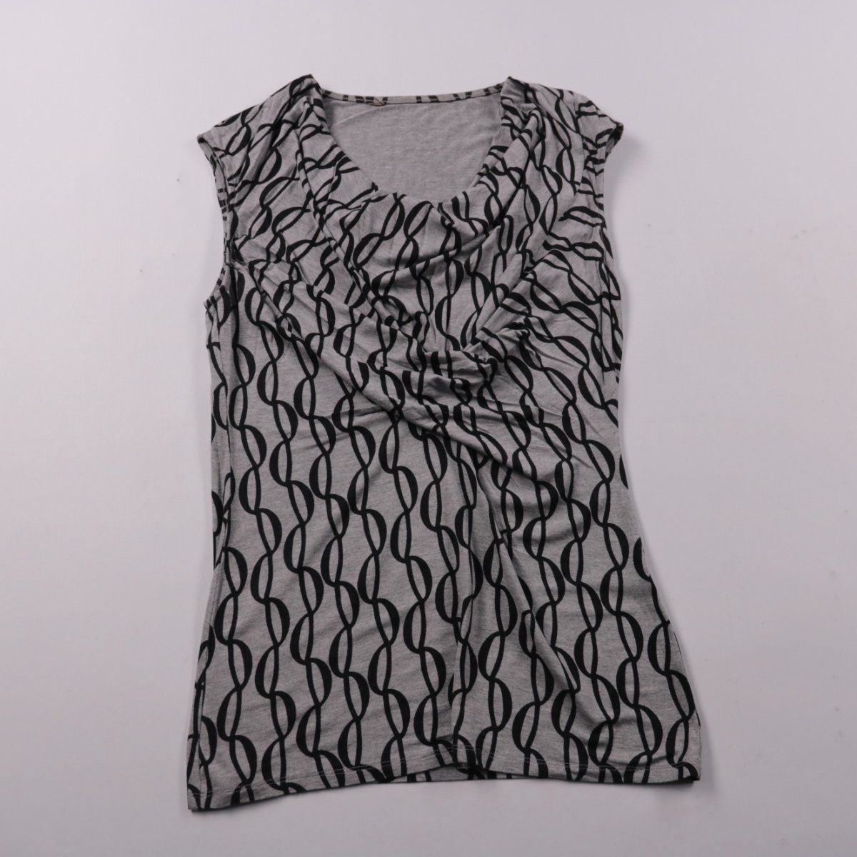 Женский топ без бренда, серого цвета с чёрным графичным принтом и драпировкой у горловины. Подойдёт для повседневных образов и офиса в сочетании с жакетом или кардиганом. Трикотажная ткань тянется и комфортно садится по фигуре.
