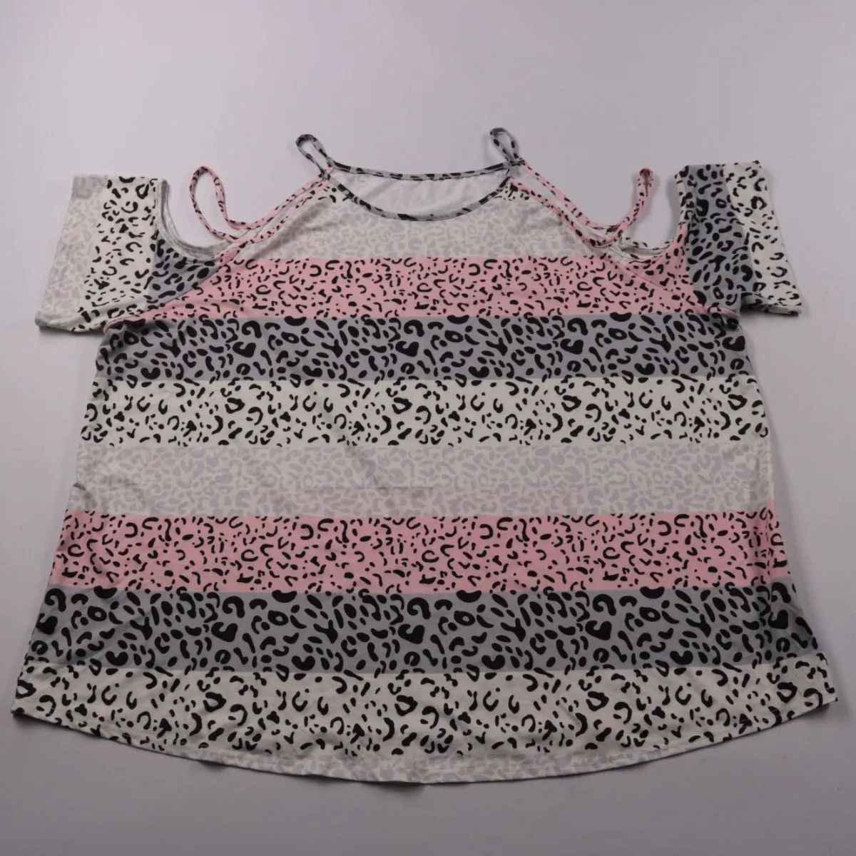 Женский топ SHEIN CURVE с вырезами на плечах и короткими рукавами, выполнен в полосатом леопардовом принте. Подойдёт для летних повседневных образов и отдыха, хорошо смотрится с джинсами и шортами. Ткань тянется за счёт эластана и комфортно садится по фигуре.