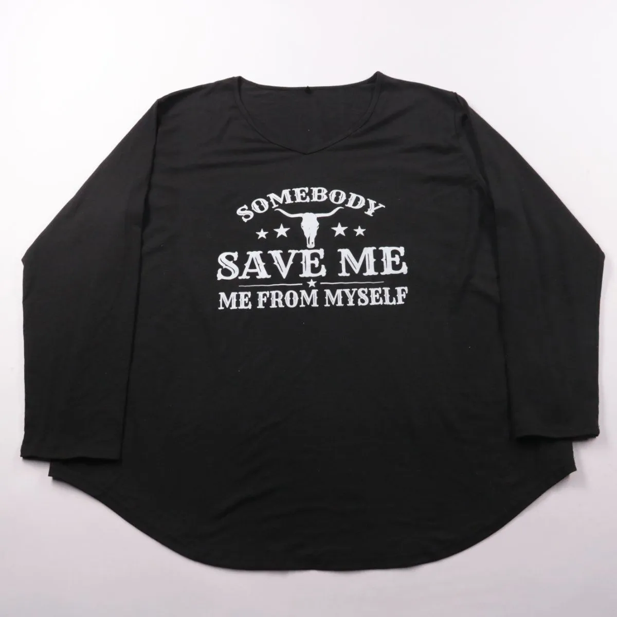 Чёрный лонгслив с V-образным вырезом и контрастным принтом «Somebody Save Me». Подойдёт для повседневной носки и образов в стиле casual. Эластичная ткань хорошо тянется и комфортно садится по фигуре.