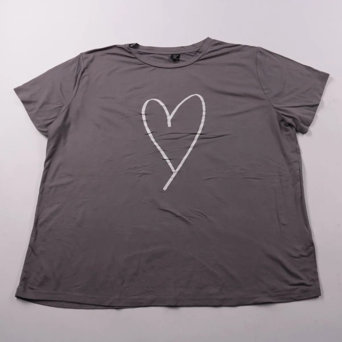 Женская футболка SHEIN CURVE серого цвета с принтом в виде сердца. Подойдёт для повседневных образов и отдыха в тёплую погоду. Практичный плюс — ткань на основе полиэстера меньше мнётся и быстро сохнет.