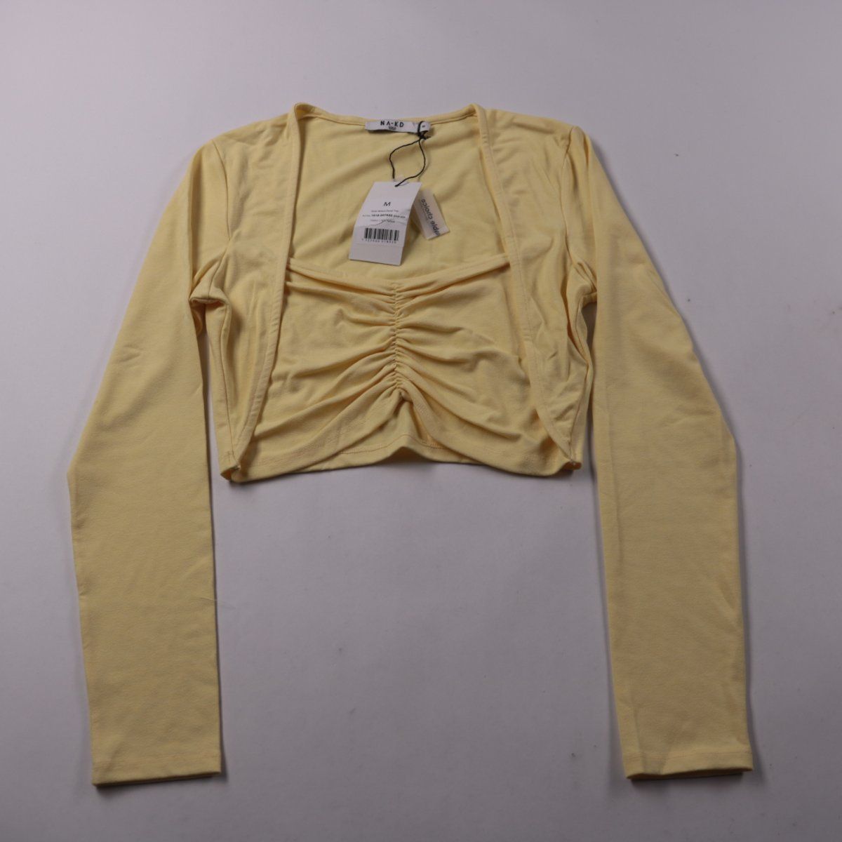 Женский укороченный лонгслив NA-KD светло-жёлтого цвета с драпировкой (сборкой) спереди. Подойдёт для повседневных образов и вечерних выходов с джинсами или юбкой. Эластичная ткань хорошо тянется и комфортно садится по фигуре.