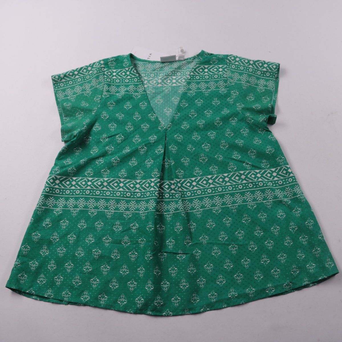 Топ VILA свободного кроя с V-образным вырезом и коротким рукавом, зелёный с белым принтом и декоративной полосой по низу. Подойдёт для тёплой погоды и повседневных образов. Лёгкий полиэстер быстро сохнет и почти не мнётся.