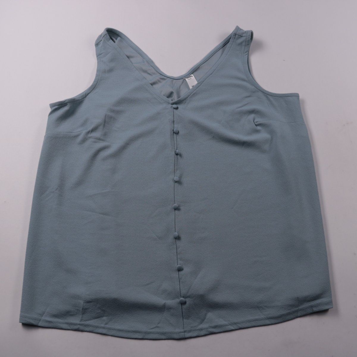 Женский топ Anko Curve пыльно-голубого цвета, без рукавов, с V-вырезом и застёжкой на пуговицы спереди. Подойдёт для лета и многослойных образов в повседневном стиле. Ткань с эластаном немного тянется и проста в уходе.