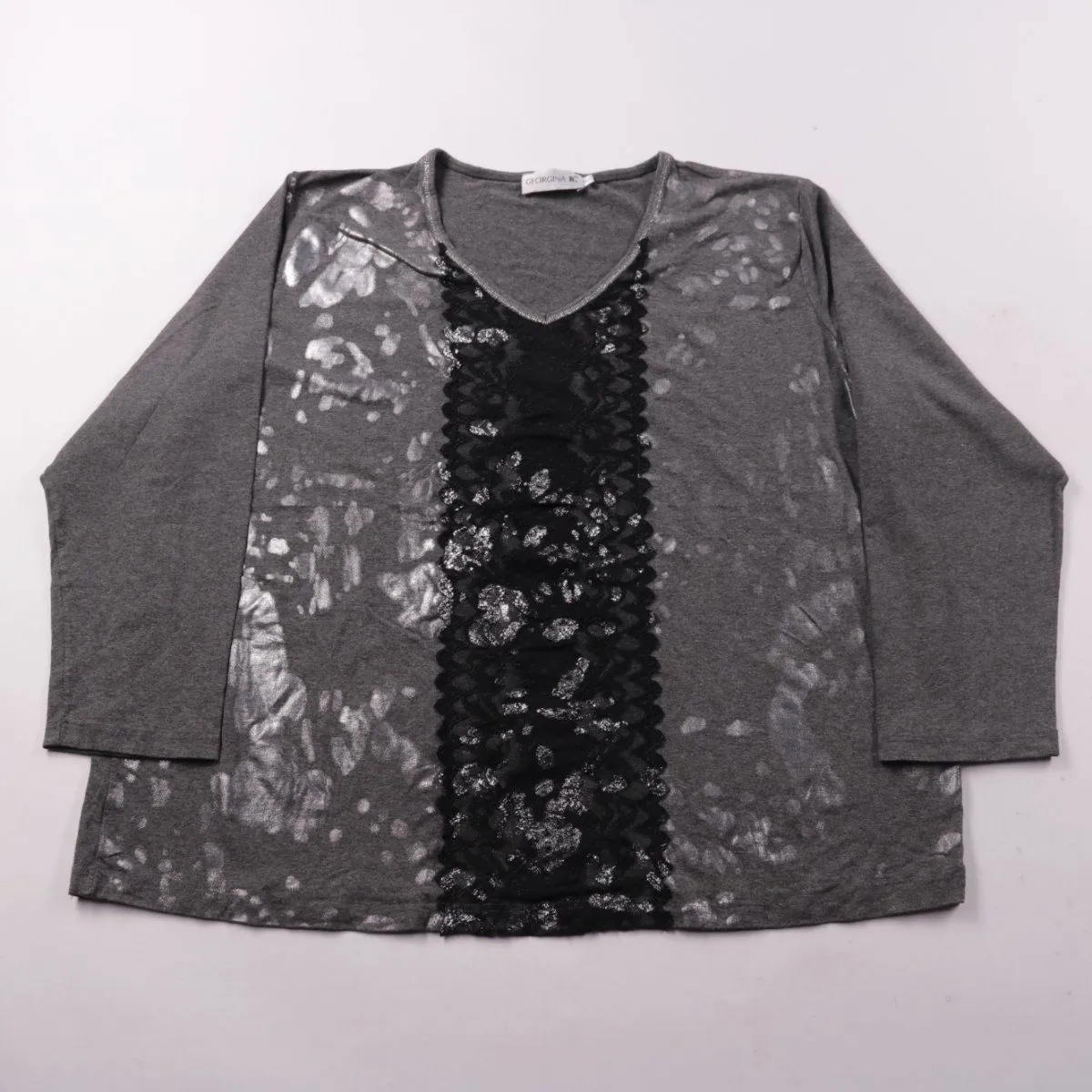 Женский лонгслив GEORGINA B. серого цвета с V-образным вырезом и декоративной чёрной вставкой спереди. Подойдёт для повседневных образов в прохладную погоду и как базовый слой. Материал на основе вискозы с эластаном хорошо тянется и комфортно сидит.