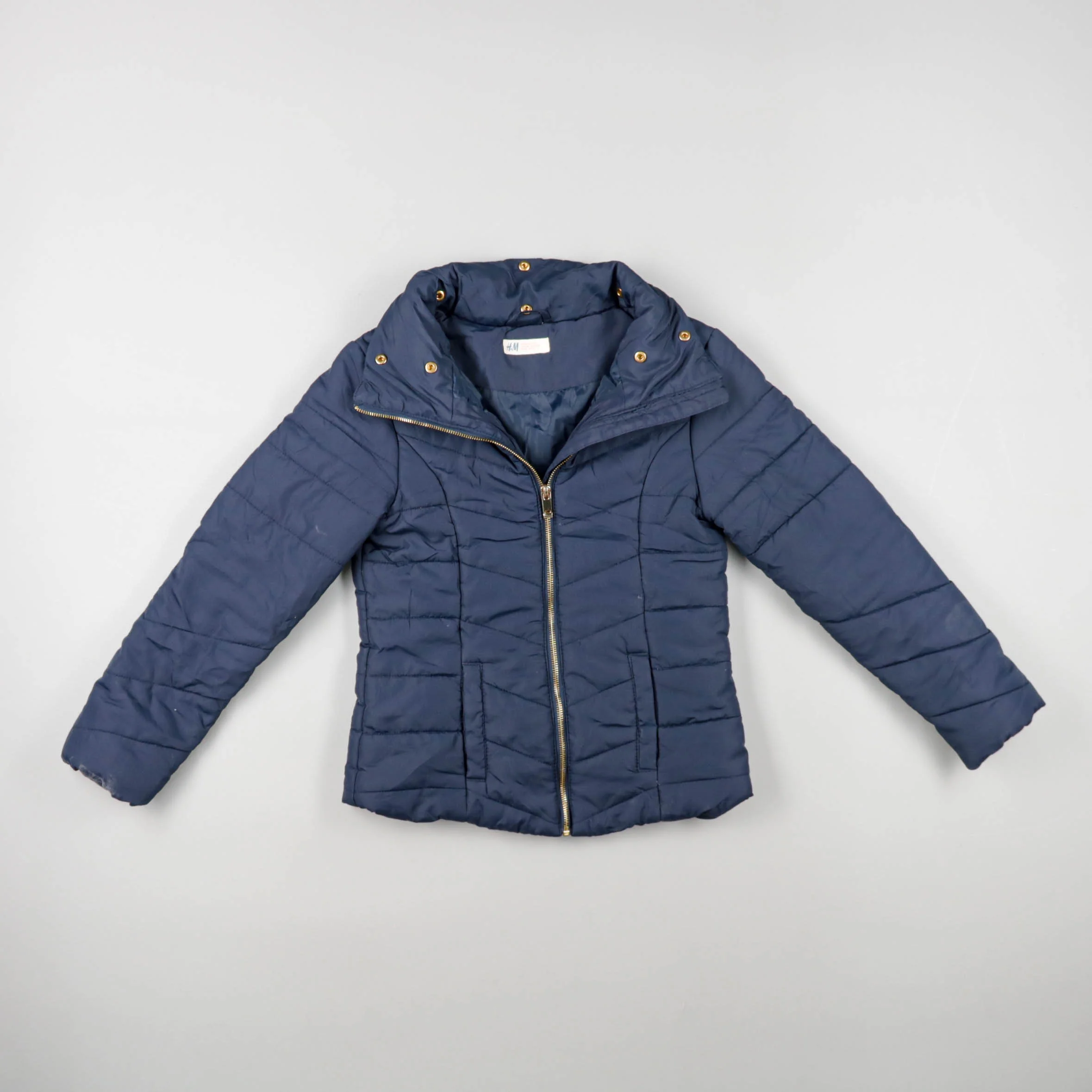 Стёганая демисезонная куртка H&M тёмно-синего цвета на молнии, с высоким воротником и карманами. Подойдёт для прохладной весны и осени и удобно смотрится в повседневных образах. Лёгкая и практичная в уходе, хорошо защищает от ветра.