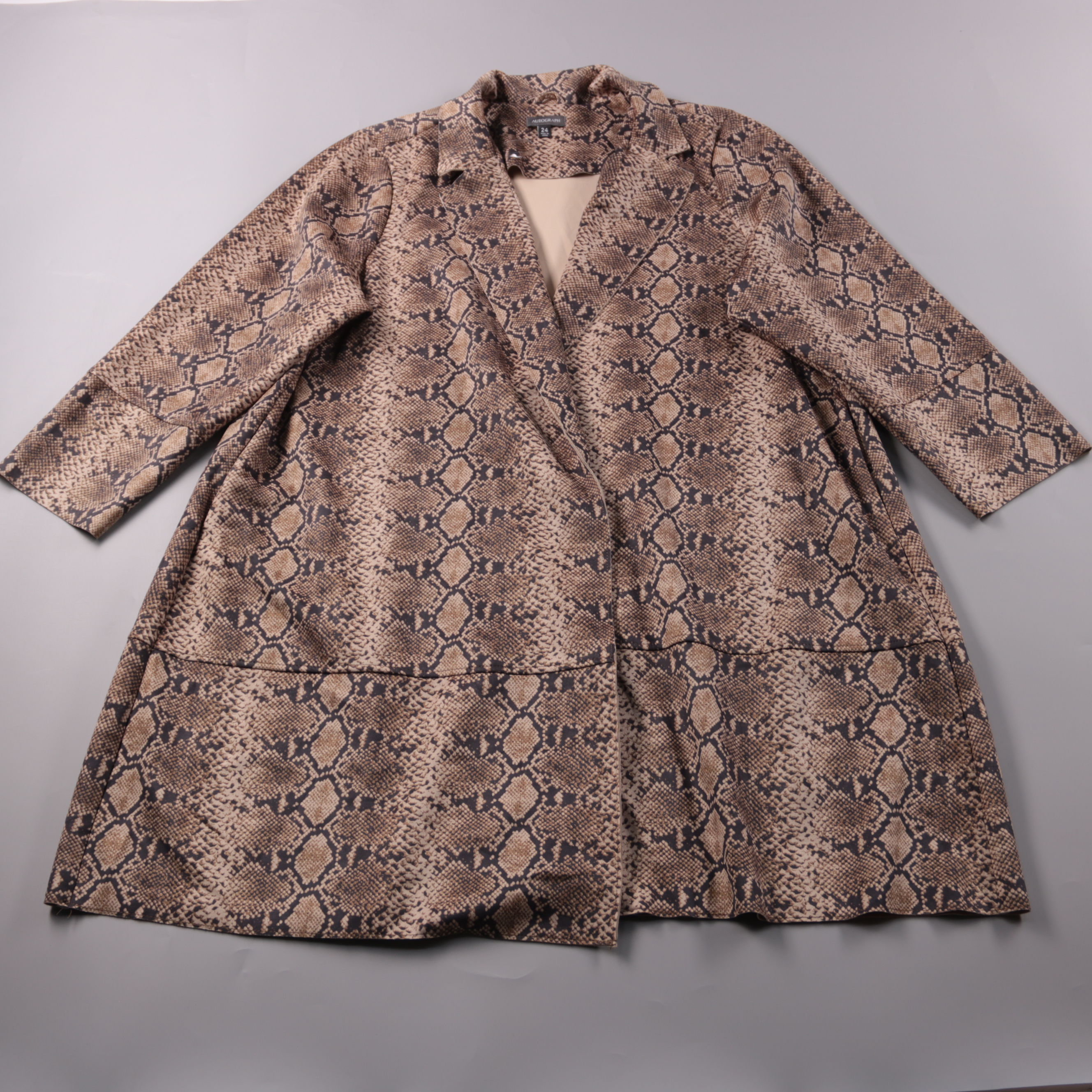 Женское пальто Autograph с принтом под змеиную кожу в бежево-коричневой гамме. Подойдёт для демисезона и образов в стиле casual/office, хорошо смотрится с базовыми вещами. Материал с эластаном даёт более комфортную посадку и не сковывает движения.