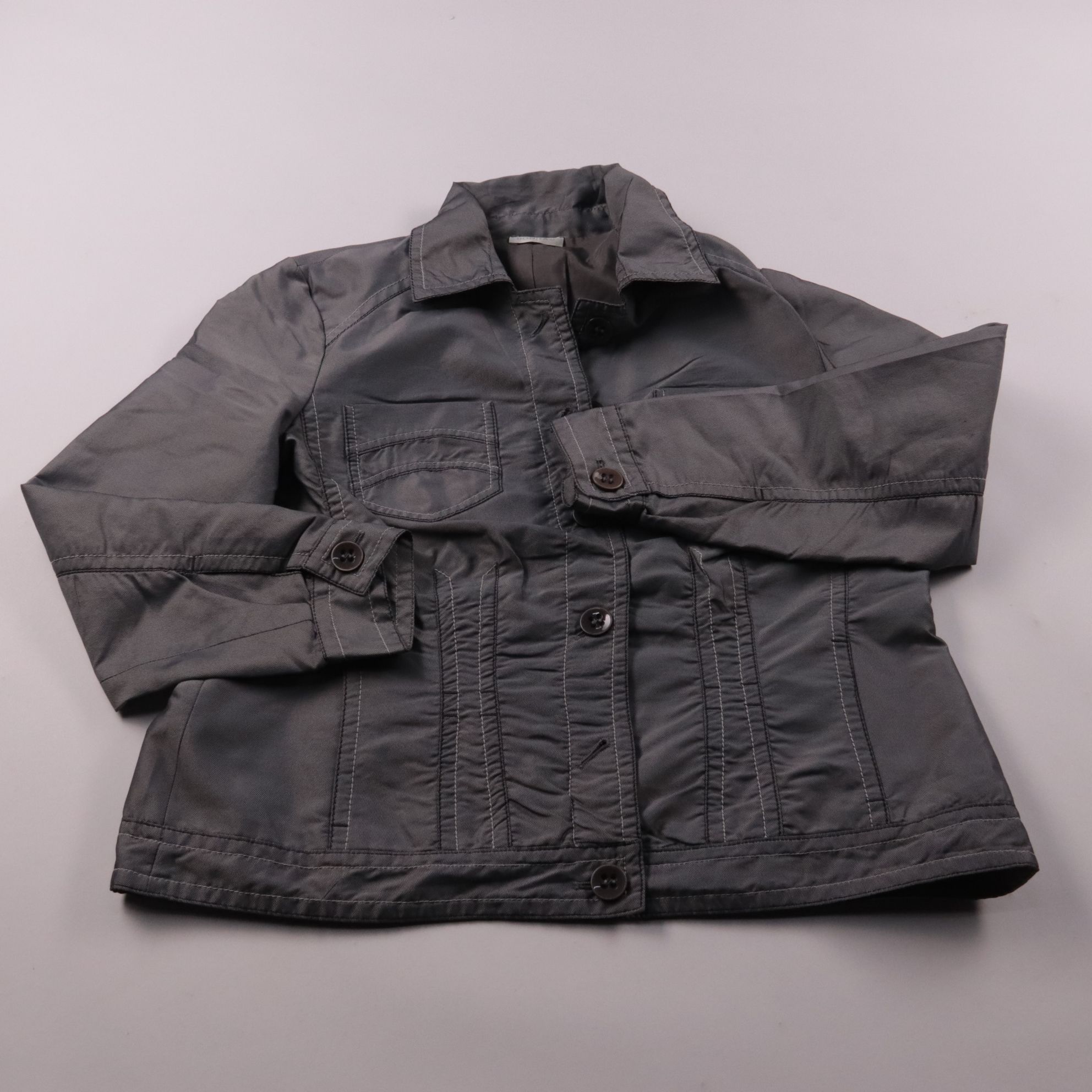 Лёгкая женская куртка Bonita серого цвета на пуговицах, с отложным воротником и нагрудным карманом. Подойдёт для прохладной погоды весной и осенью, удобно носить с джинсами и брюками. Практичный материал из полиэстера легко очищается и быстро сохнет.