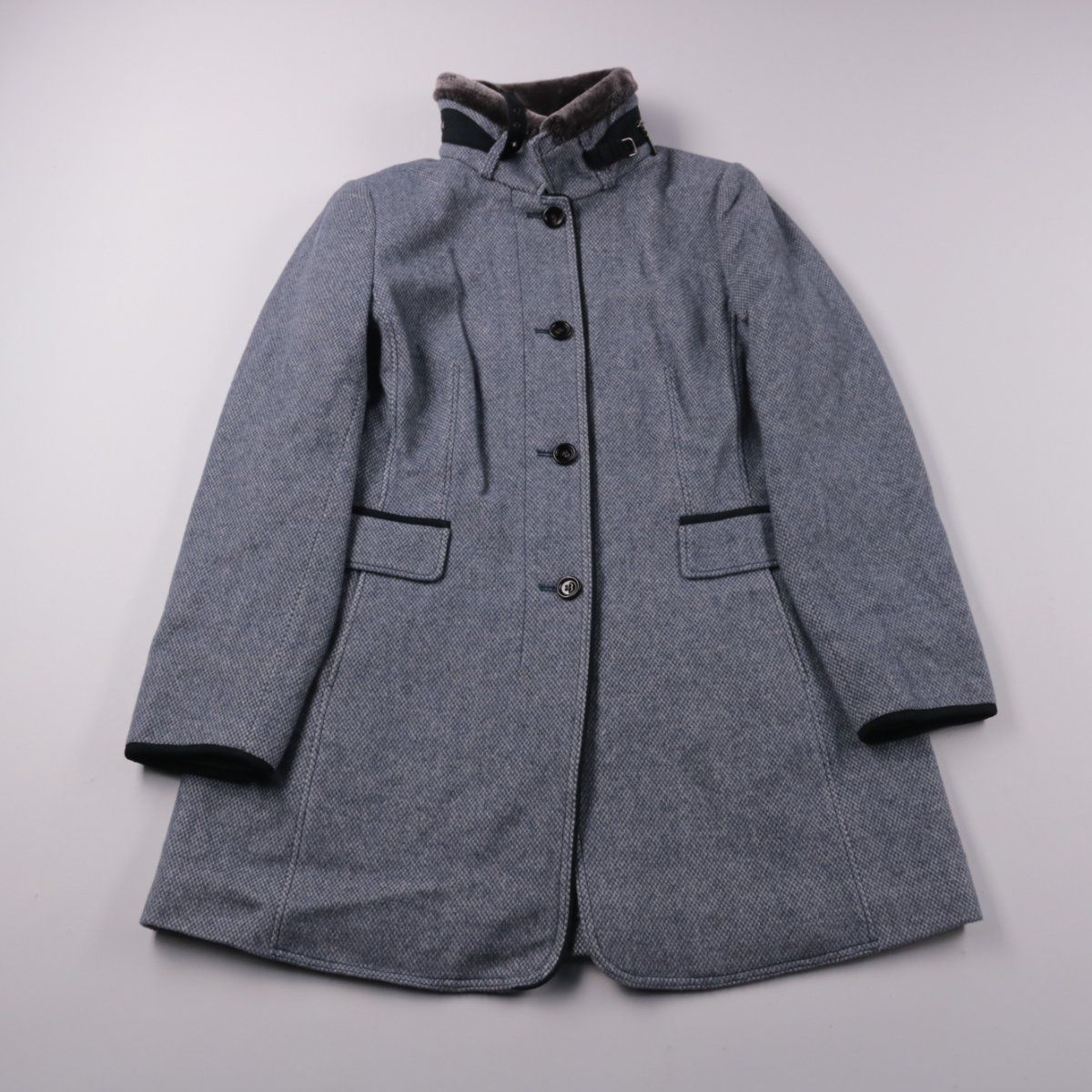 Женское пальто Gil Bret серого цвета с застёжкой на пуговицы и воротником-стойкой с ремешком. Подойдёт для прохладной весны и осени, удобно смотрится и с брюками, и с платьями. Практичный плюс — тёплая стёганая подкладка и карманы с клапанами.