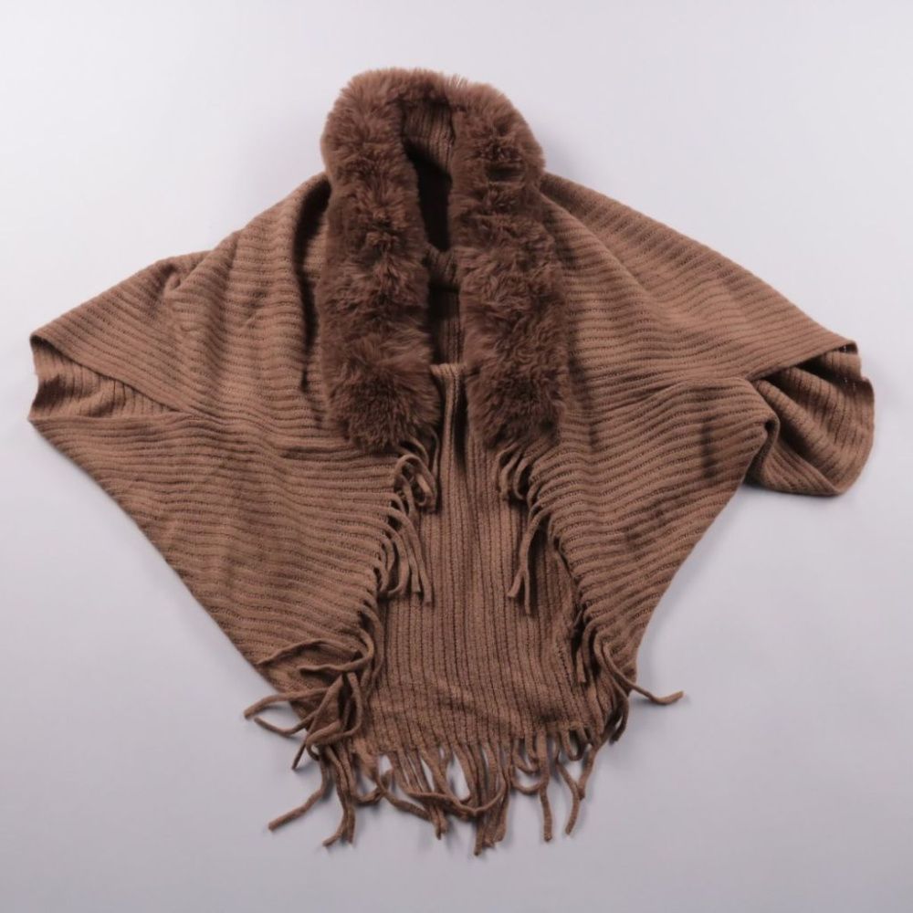Вязаный шарф с меховой отделкой и бахромой, бренд не указан. Подойдёт для холодной погоды и образов в спокойной гамме. Практичное преимущество — хорошо защищает шею и можно носить как накидку на плечи.