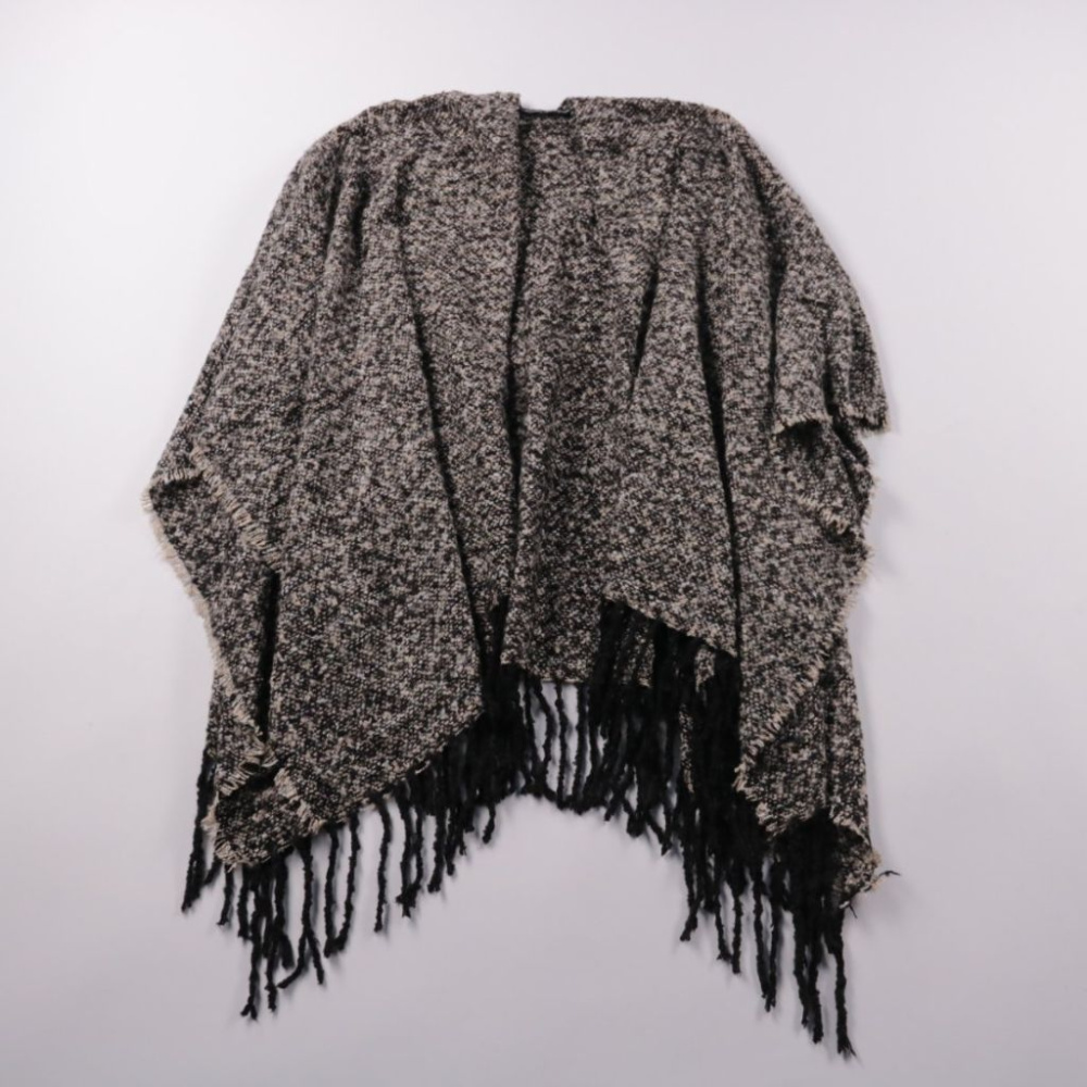 Накидка‑пончо LaTosca в серо‑чёрном меланже с длинной бахромой по краю. Подойдёт для прохладной погоды в межсезонье и как верхний слой поверх водолазки или лонгслива. Свободный крой не сковывает движения и легко комбинируется с базовыми вещами.
