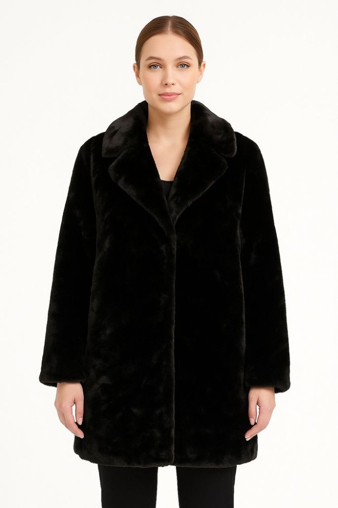 Женская шуба из искусственного меха чёрного цвета, прямого силуэта с мягким отложным воротником. Подойдёт для зимних прогулок и повседневных образов с джинсами или платьем. Практичный плюс — материал и подкладка из 100% полиэстера, легко ухаживать (сти...