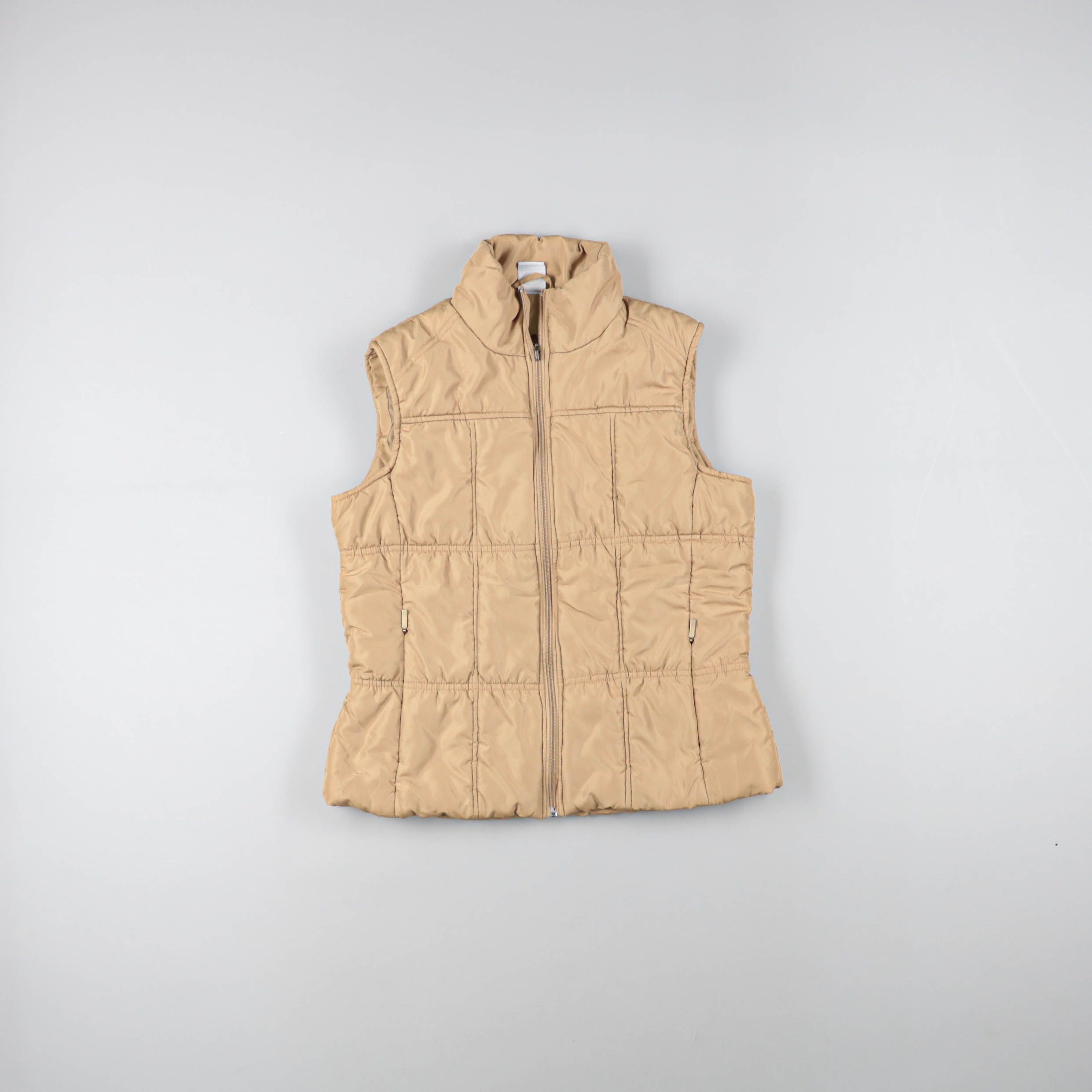Утеплённый стёганый жилет без бренда в бежевом цвете, на молнии и с высоким воротником. Подойдёт для прогулок и поездок в прохладную погоду, удобно надевать поверх худи или свитера. Лёгкий и практичный, есть карманы на молнии для мелочей.