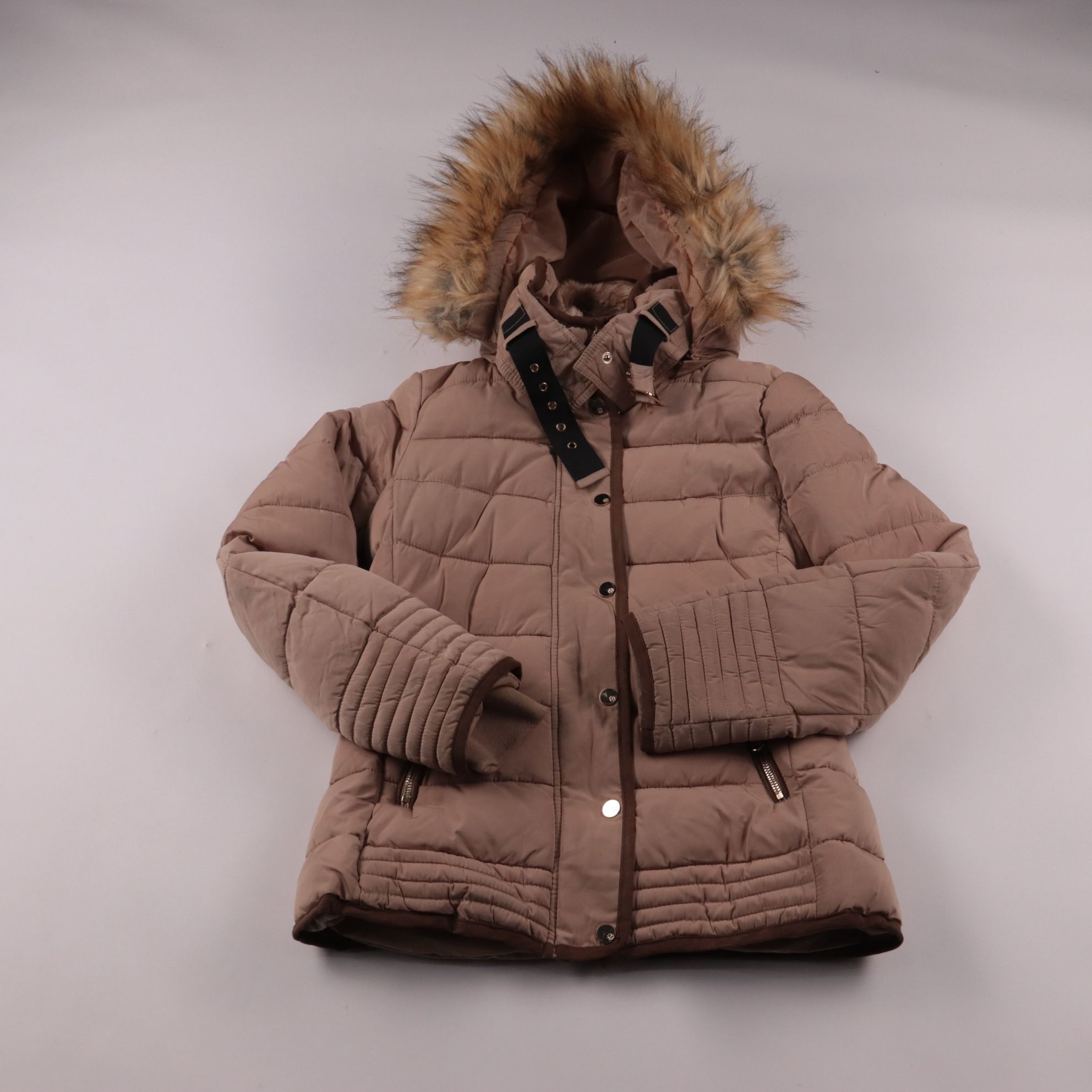 Зимняя стёганая куртка Louise de Paris с капюшоном и меховой опушкой, в спокойном бежево-розовом оттенке. Подойдёт для прогулок и поездок в холодную погоду благодаря тёплому объёму и высокой стойке. Практичные карманы на молнии и застёжка на кнопки пом...