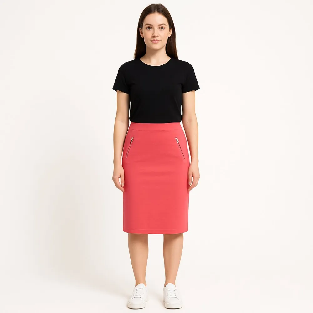 Юбка-карандаш Donna Due кораллового цвета, длина миди, с декоративными молниями у карманов. Подойдёт для офиса и повседневных образов с базовыми футболками и блузами. Плотный материал хорошо держит форму и аккуратно садится по фигуре.