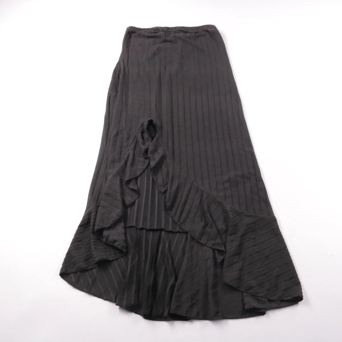 Длинная юбка Shein Curve из чёрной ткани в рубчик/плиссе с воланом по низу и асимметричным подолом. Подойдёт для повседневных образов и на выход, легко сочетается с базовыми топами и обувью. Эластичный пояс комфортно садится по талии.